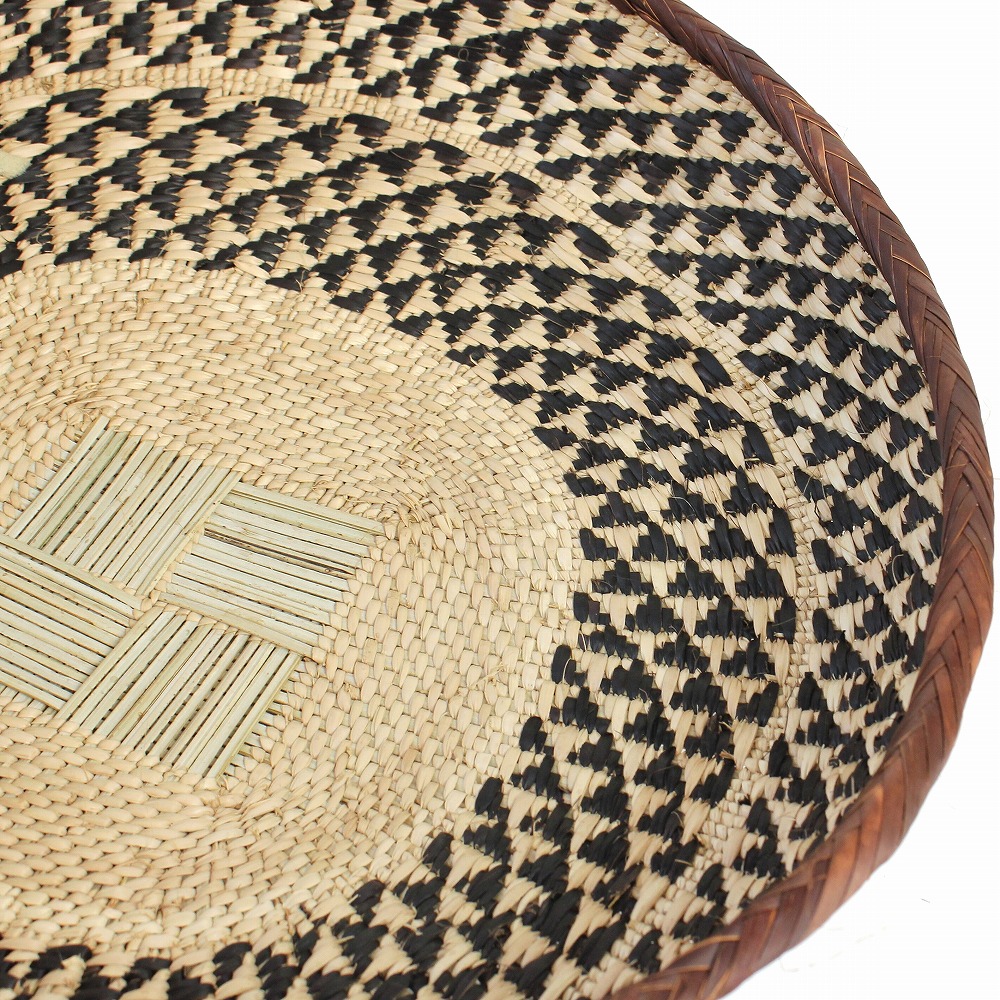 トンガバスケットは、ジンバブエ西部のビンガ地方で、 トンガ人の女性たちによってイララ(椰子の葉)を手編みして作られています。もとは穀物を運んだり選別するために使用されていました。 ストライプや蜘蛛の巣模様、稲妻模様などの伝統的なデザインと、四角い底の土台が特徴的。 放射状の葛に、ナチュラルなイララの葉と、樹皮や根、泥で染色を繰り返したブラウンの葉の二色が編み込まれ、二つとして同じ柄がないというの美しいカゴを創り出します。 また壺に似せたカラバッシュカゴをはじめ、様々なフォルムのカゴを器用に編み上げます。 これらは干ばつと貧困に見舞われやすい地域に住むトンガの人々にとって、貴重な現金収入となっています。 ひとつひとつ表情が異なるバスケットは、インテリアアイテムとして近年注目されています。