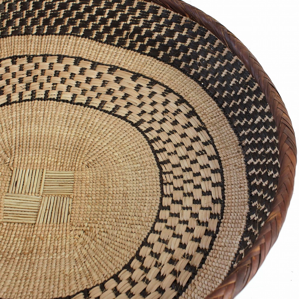 トンガバスケットは、ジンバブエ西部のビンガ地方で、 トンガ人の女性たちによってイララ(椰子の葉)を手編みして作られています。もとは穀物を運んだり選別するために使用されていました。 ストライプや蜘蛛の巣模様、稲妻模様などの伝統的なデザインと、四角い底の土台が特徴的。 放射状の葛に、ナチュラルなイララの葉と、樹皮や根、泥で染色を繰り返したブラウンの葉の二色が編み込まれ、二つとして同じ柄がないというの美しいカゴを創り出します。 また壺に似せたカラバッシュカゴをはじめ、様々なフォルムのカゴを器用に編み上げます。 これらは干ばつと貧困に見舞われやすい地域に住むトンガの人々にとって、貴重な現金収入となっています。 ひとつひとつ表情が異なるバスケットは、インテリアアイテムとして近年注目されています。