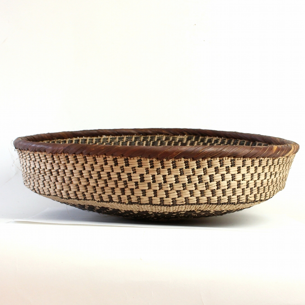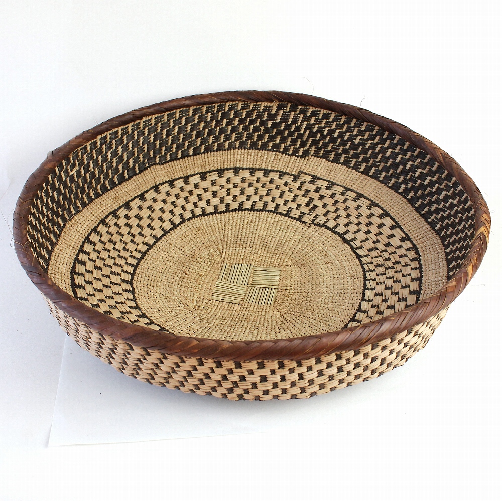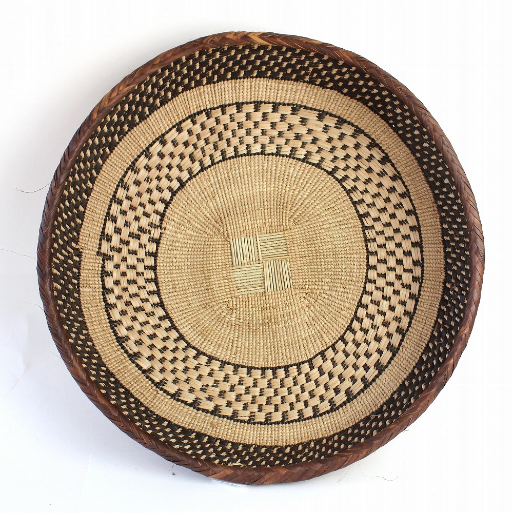 ニャミニャミバスケット:ザンビアからは大変珍しいバスケットが多数届きました。 ムニュムブエの人たちが手作りしたニャミニャミバスケット。ニャミニャミ(Nyami Nyami)とは波型の意味で、ザンベジ川に棲む川の神の名前でもあるそうです。 白い部分はイララ椰子、焦げ茶の透かし部分は水草を使用したデザイン。高いかご編み技術ならではの個性的なフォルムのバスケット。 他にも鳥の巣のようなタティンガもつれバスケット、婚礼の贈り物として母から娘へと代々受け継がれているマケンゲウェディングバスケットなどなど、 ザンビアは貴重なアフリカンバスケットの宝庫です。唯一無二の、芸術性の高いバスケットをご覧ください。