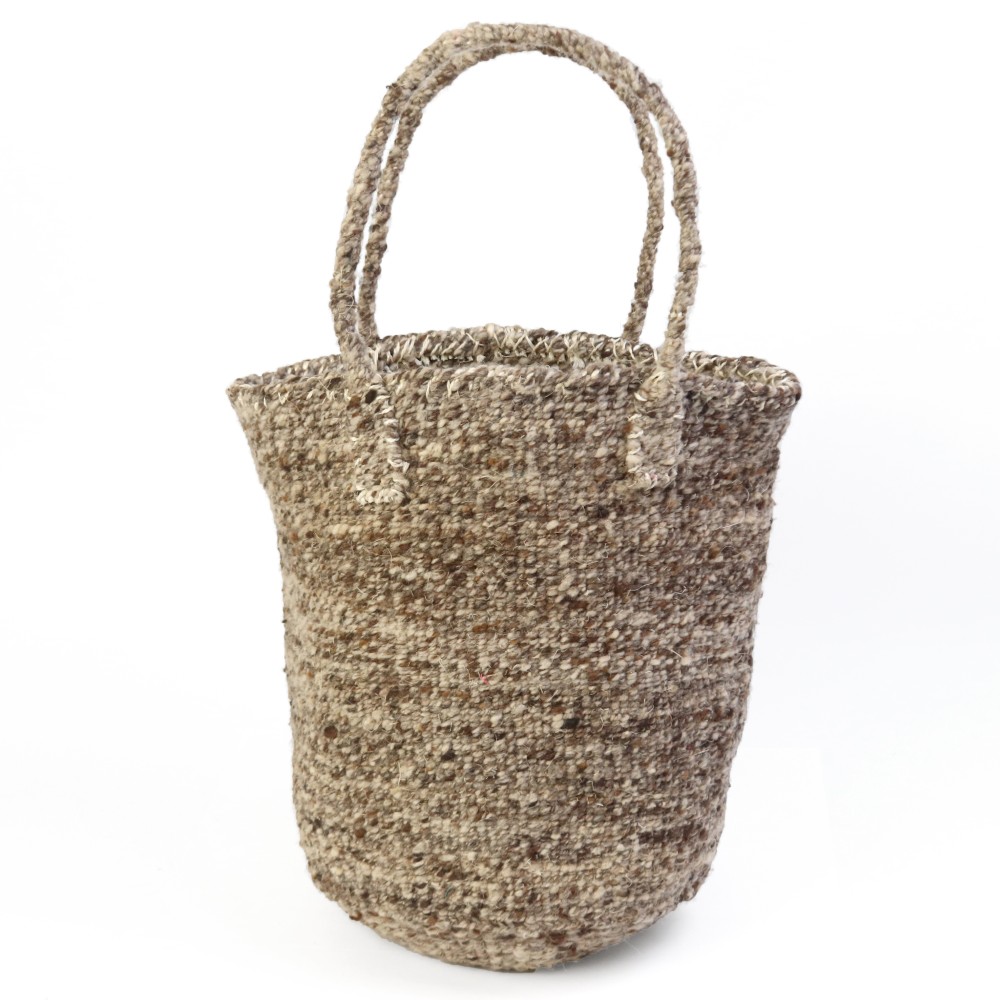 羊毛ウールの柔らかい風合いと手触りが秋冬にぴったりなやや縦長のウールサイザルバッグです。サイザル麻を芯に、同色の羊毛を集めて手で紡いだの毛糸で編みこみました。染色してない自然な色合いと、手紡ぎならではのぼこぼこ感がが魅力のバッグ。永くご愛用頂きたいバッグです。