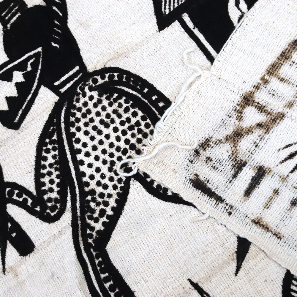 コロゴ布はセヌフォの人々が暮らす中心都市、コートジボワール北部のまちコロゴで作られる織物です。動物や伝説上の生き物や精霊などそのモチーフはみな、セヌフォの人々に伝わる神話や文化に根差したものです。特徴的な黒い絵柄は、現地のもろこしなどの煮出し液を発酵した液で描き、定着液にレモンを使用しています。ベースの綿布は、手紬+手織の帯布を貼り合わせた一枚布です。