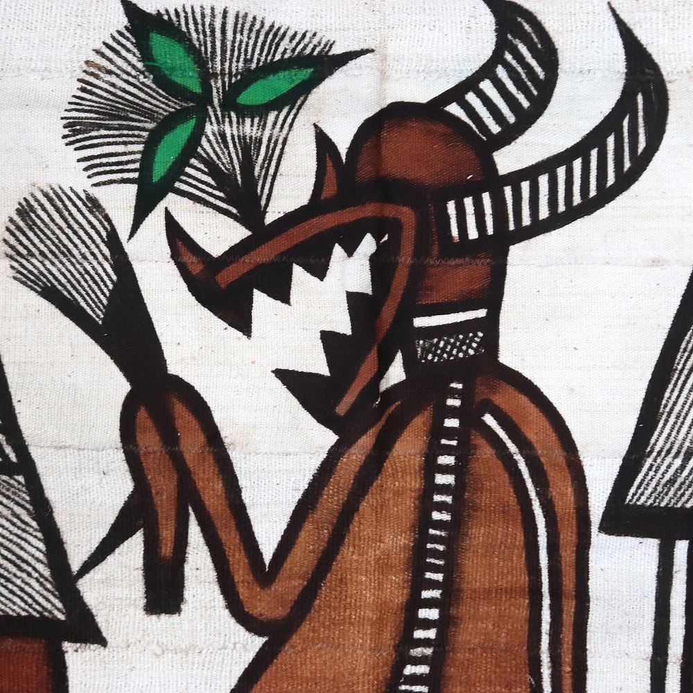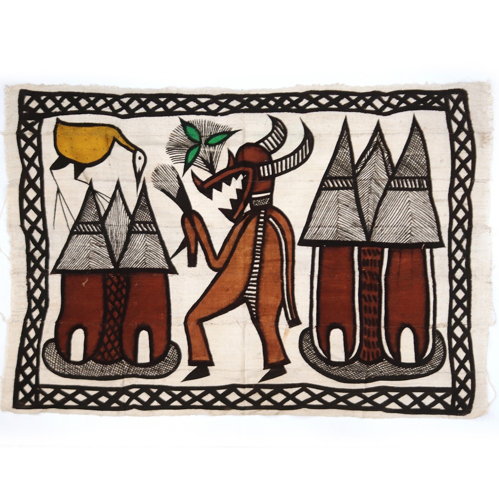 独特のタッチで描かれる独創的なモチーフが印象的なこの布は、もろこしなどの現地の植物を煮出し発酵させた染料で描かれています。 動物や伝説上の生き物や精霊また、生活から着想したものなどそのモチーフはみなコロゴの文化と神話に根差したものです。