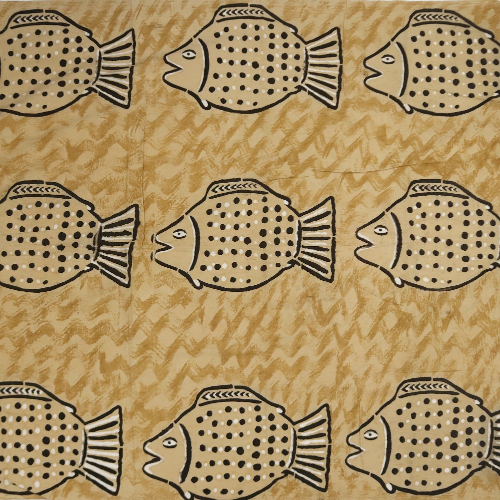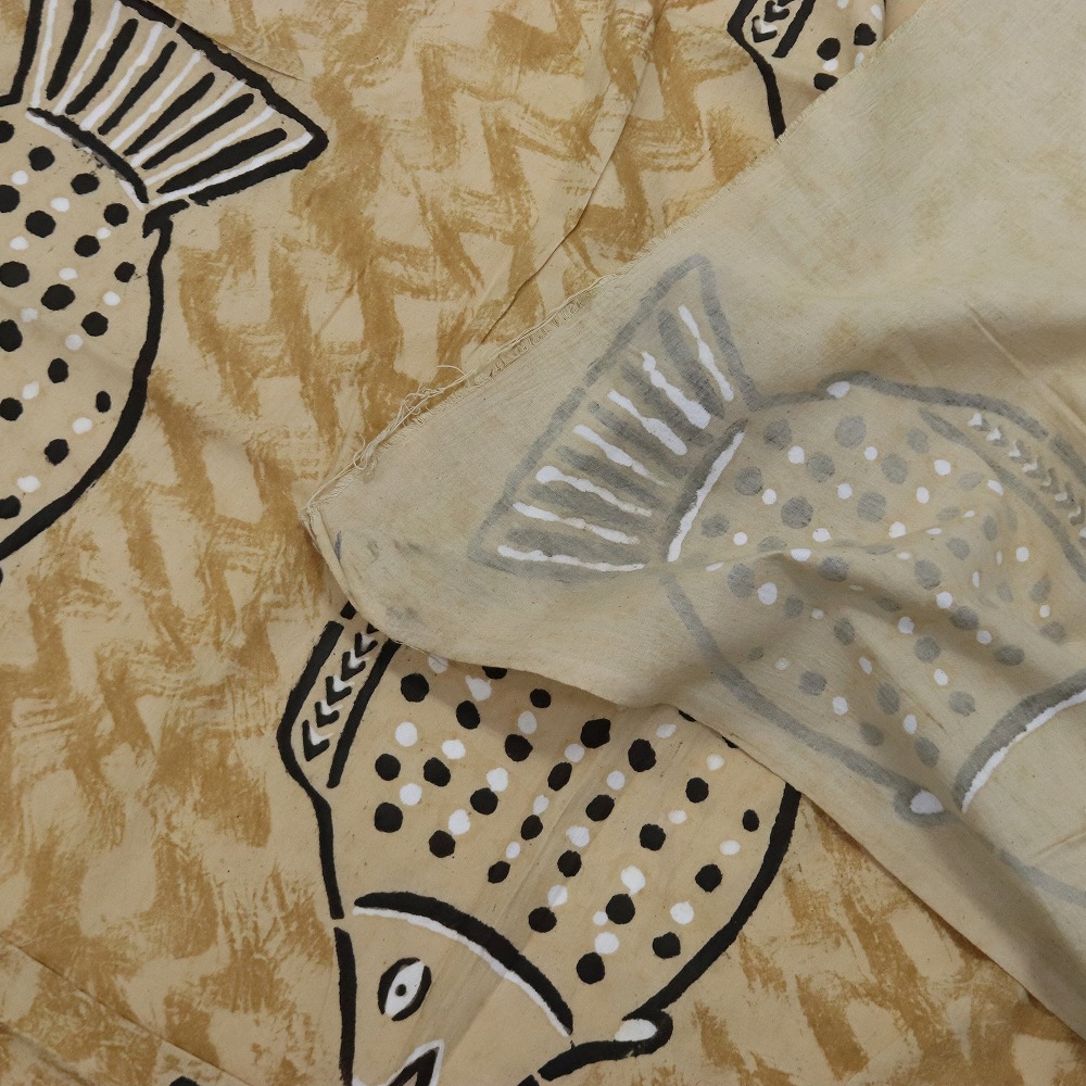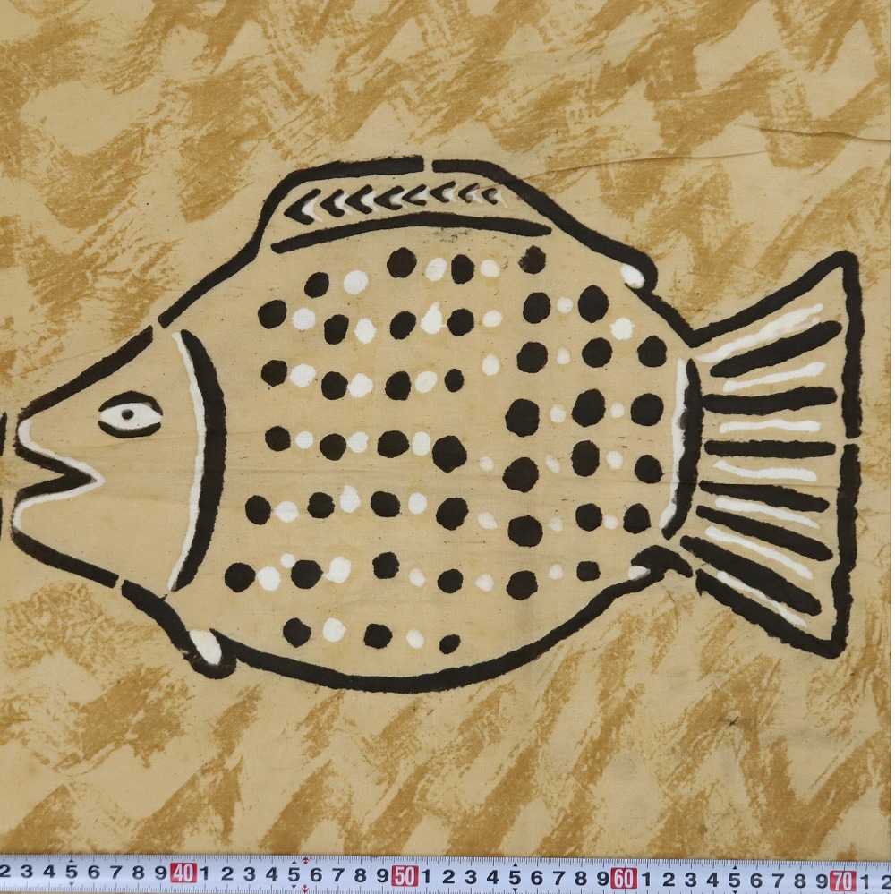 手織り布にガラマの葉で黄色く染める。→その上に泥で柄を描く→陽光にしばらくさらす。→ 水洗いすると、泥の柄がくっきり出る→何度もこの工程を繰り返す→泥染めの黒が定着