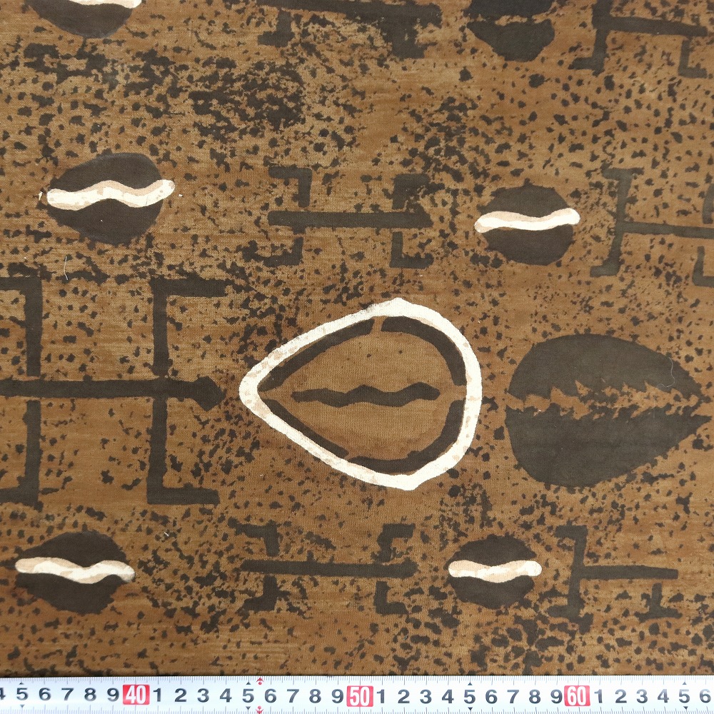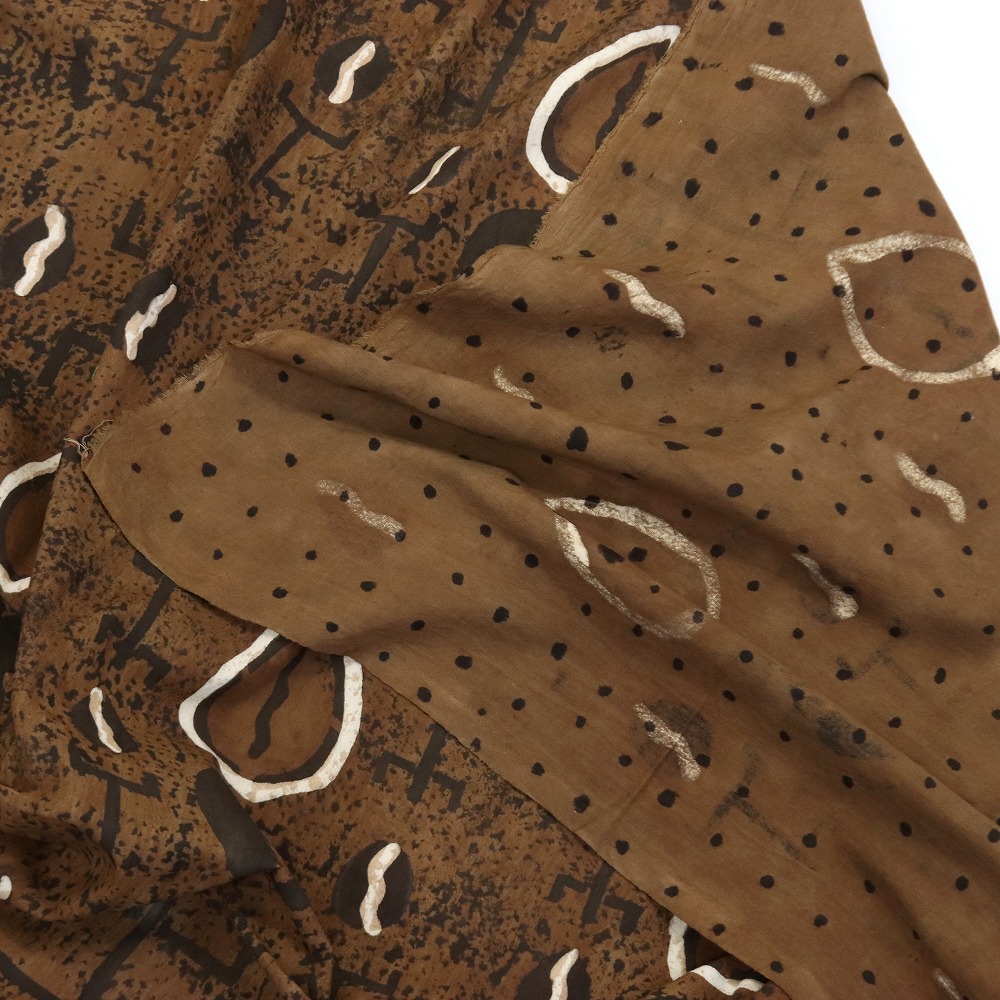 しっかりしたクレトン生地を泥染め抽象柄に染め上げました。伝統的な方法で何度も行程を重ね染められています。そのままインテリアクロスとしてお使いいただけますが、手作り派には服・バッグ・クッションなどの素材としてもお薦めです。天然染料のため色落ちがあります。洗濯の際にはドライクリーニングか水洗いをおすすめします。1M切り売りです。