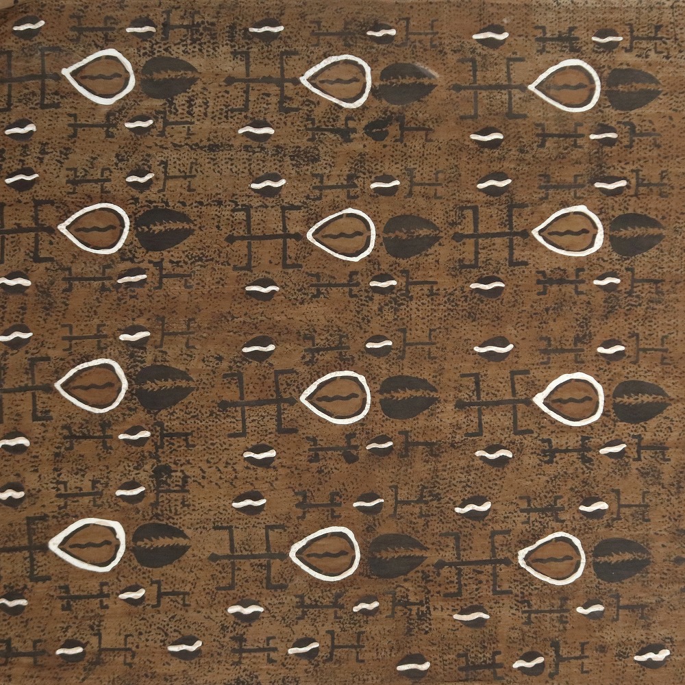 手織り布にガラマの葉で黄色く染める。→その上に泥で柄を描く→陽光にしばらくさらす。→ 水洗いすると、泥の柄がくっきり出る→何度もこの工程を繰り返す→泥染めの黒が定着