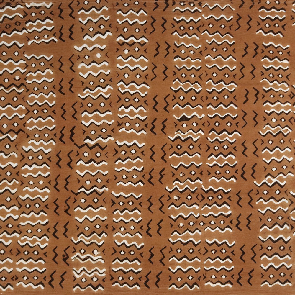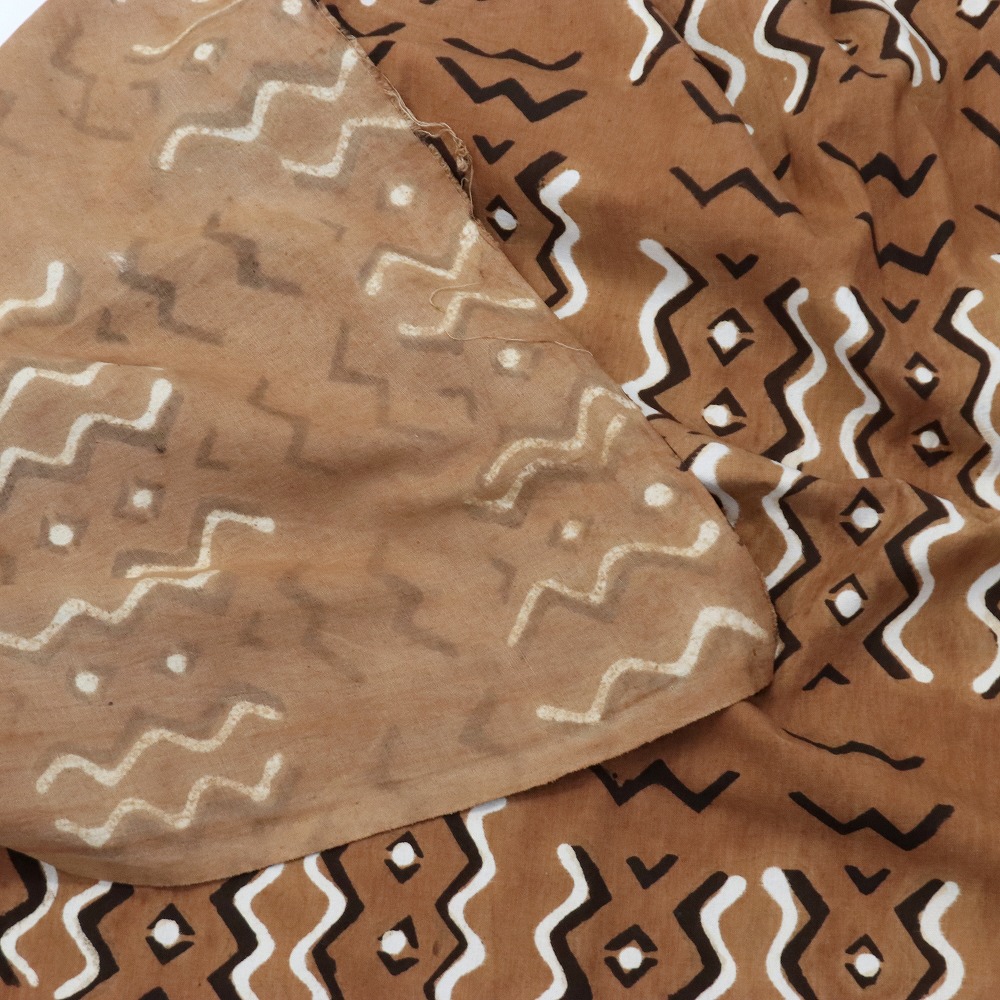 しっかりしたクレトン生地を泥染め抽象柄に染め上げました。伝統的な方法で何度も行程を重ね染められています。そのままインテリアクロスとしてお使いいただけますが、手作り派には服・バッグ・クッションなどの素材としてもお薦めです。天然染料のため色落ちがあります。洗濯の際にはドライクリーニングか水洗いをおすすめします。1M切り売りです。