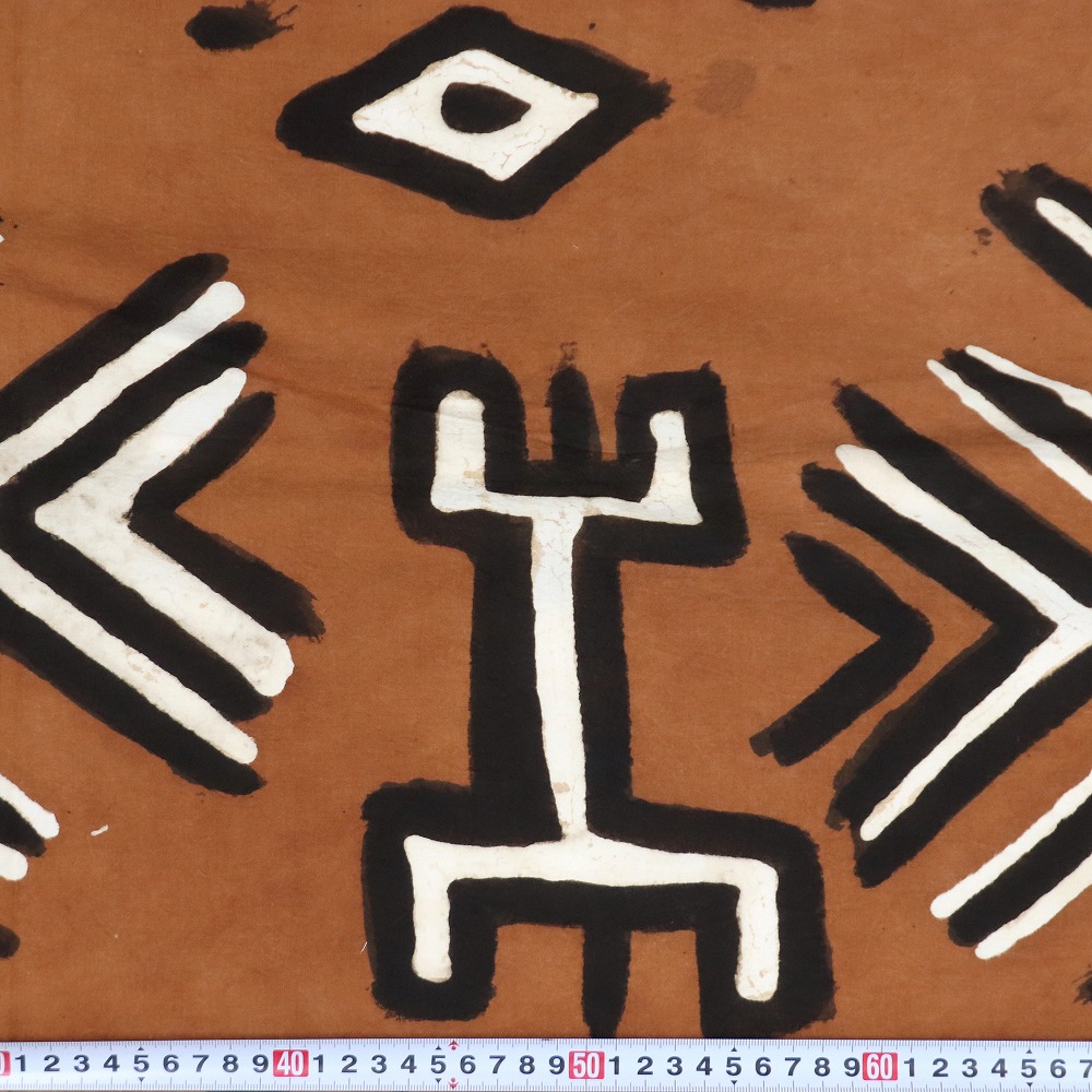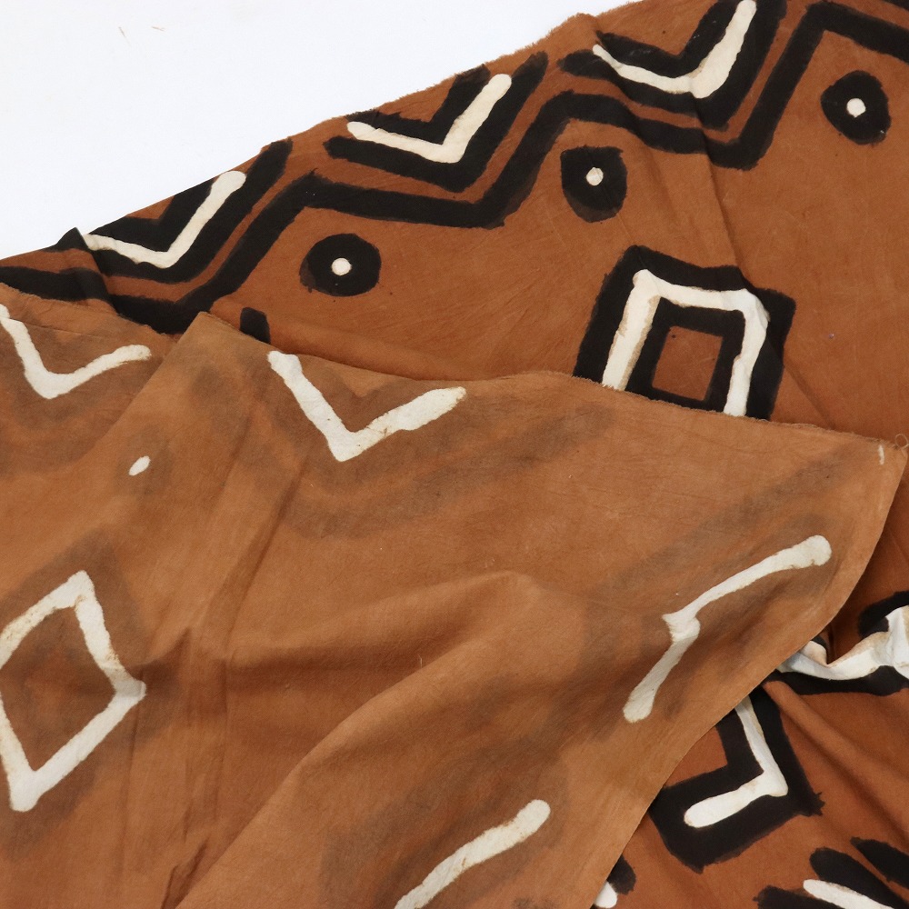 しっかりしたクレトン生地を泥染め抽象柄に染め上げました。伝統的な方法で何度も行程を重ね染められています。そのままインテリアクロスとしてお使いいただけますが、手作り派には服・バッグ・クッションなどの素材としてもお薦めです。天然染料のため色落ちがあります。洗濯の際にはドライクリーニングか水洗いをおすすめします。1M切り売りです。