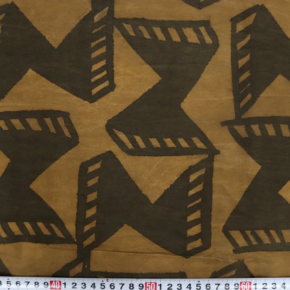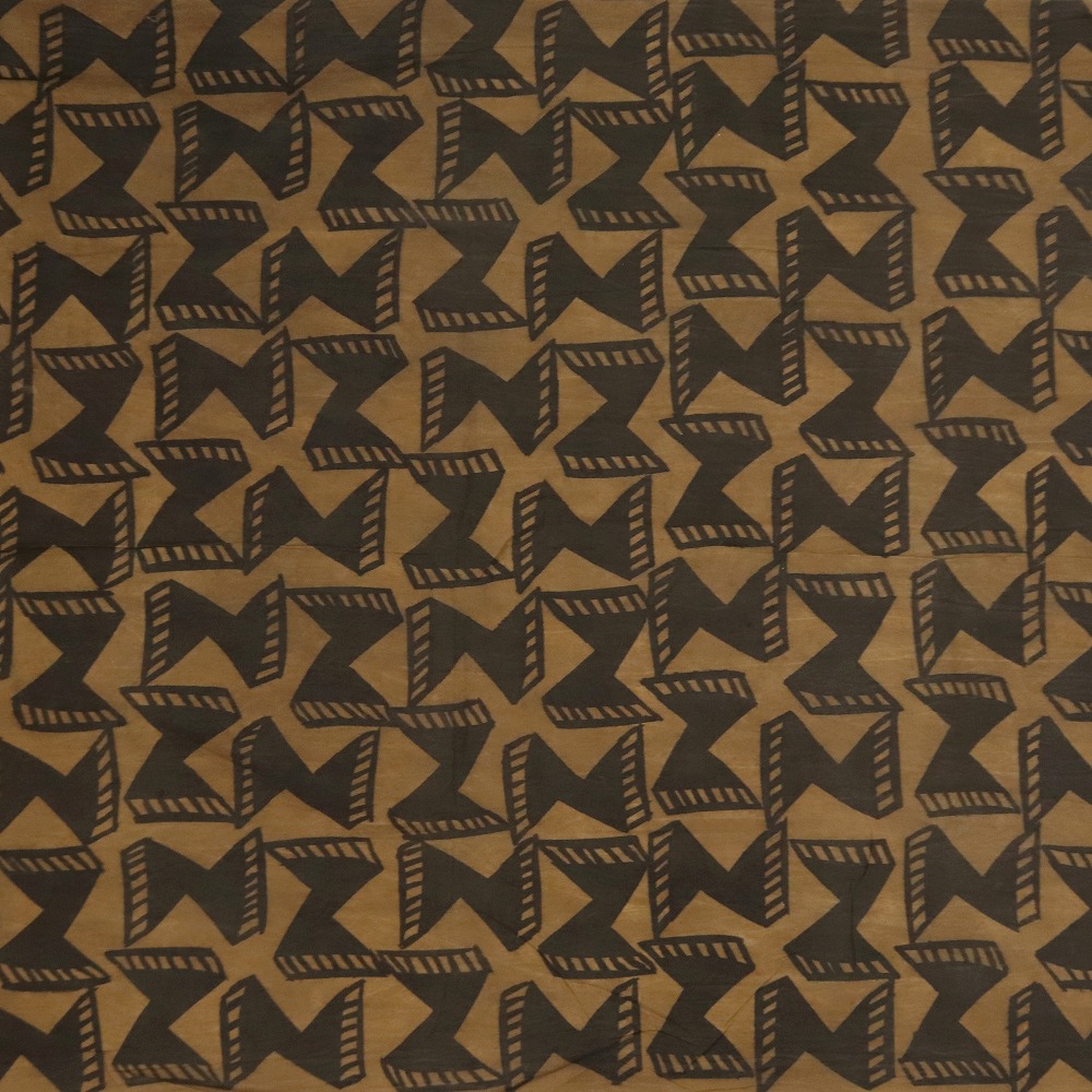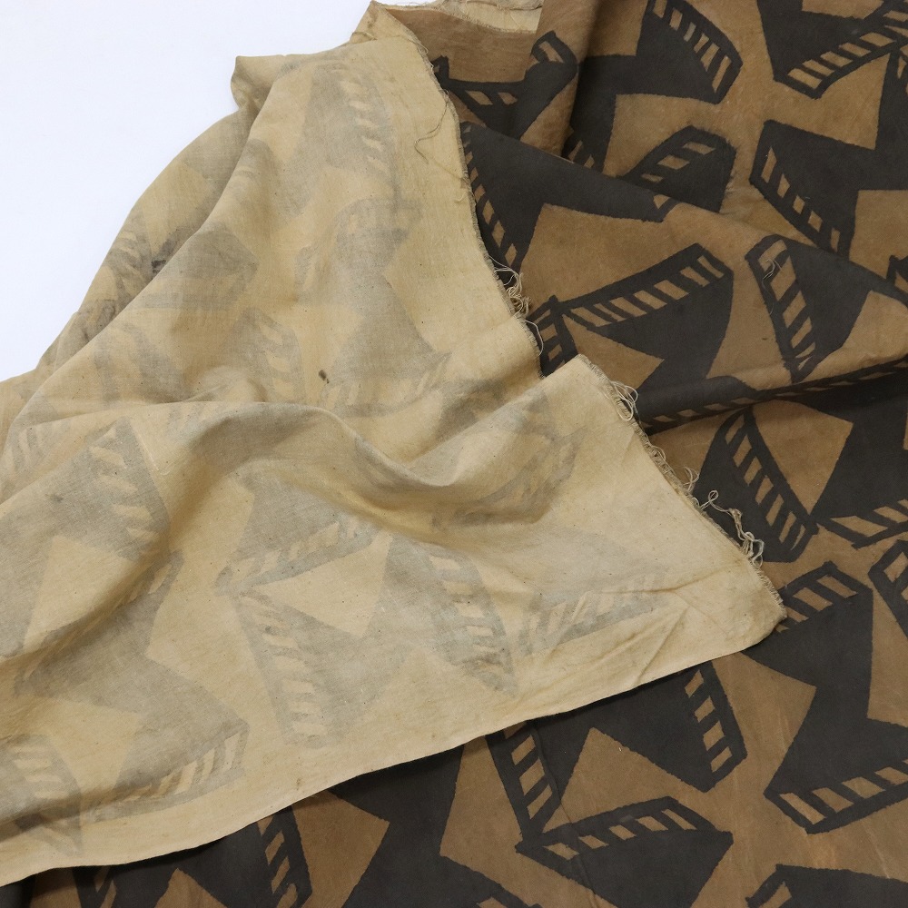 しっかりしたクレトン生地を泥染め抽象柄に染め上げました。伝統的な方法で何度も行程を重ね染められています。そのままインテリアクロスとしてお使いいただけますが、手作り派には服・バッグ・クッションなどの素材としてもお薦めです。天然染料のため色落ちがあります。洗濯の際にはドライクリーニングか水洗いをおすすめします。1M切り売りです。
