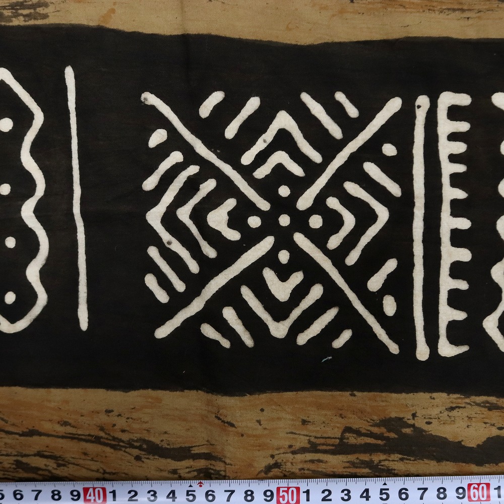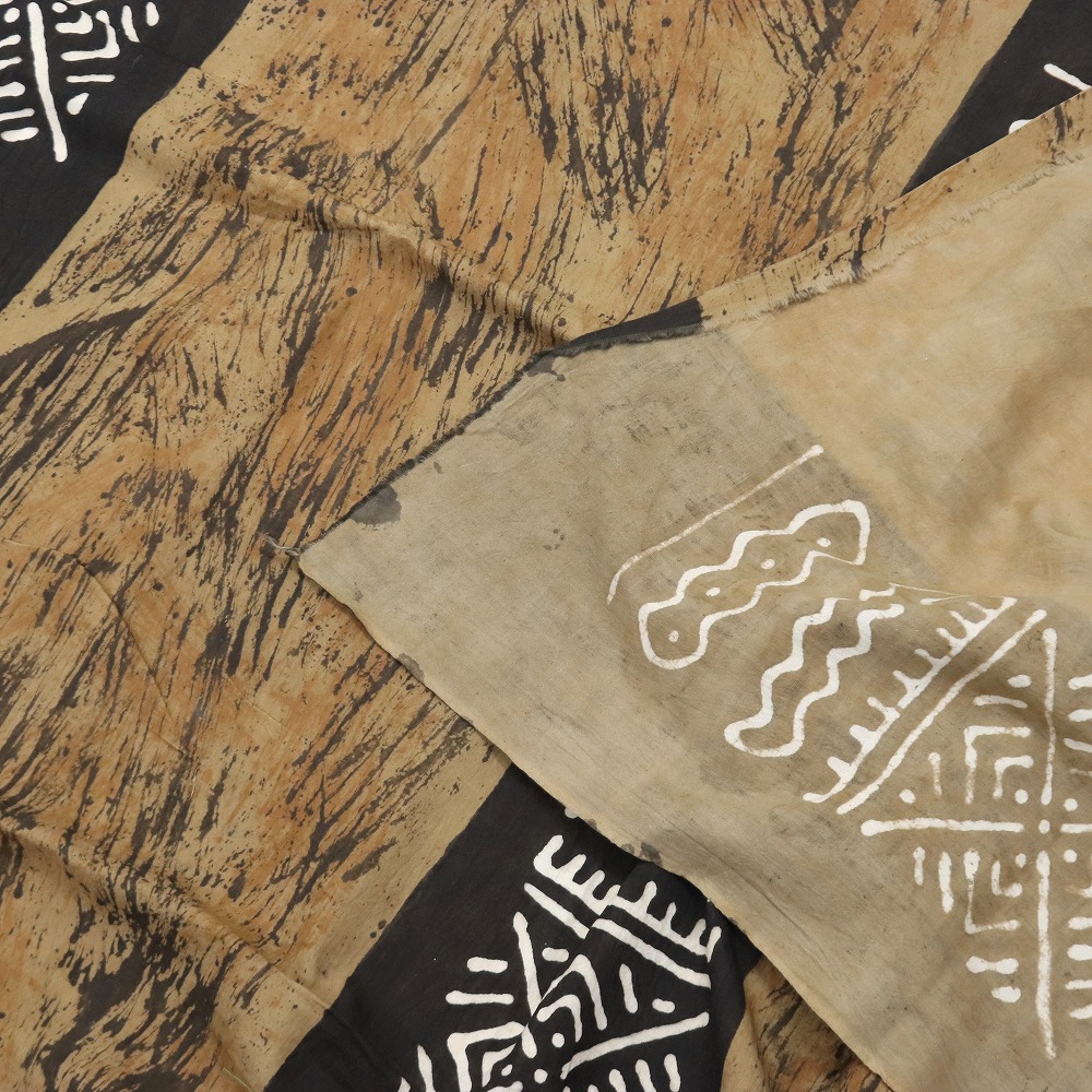 しっかりしたクレトン生地を泥染め抽象柄に染め上げました。伝統的な方法で何度も行程を重ね染められています。そのままインテリアクロスとしてお使いいただけますが、手作り派には服・バッグ・クッションなどの素材としてもお薦めです。天然染料のため色落ちがあります。洗濯の際にはドライクリーニングか水洗いをおすすめします。1M切り売りです。