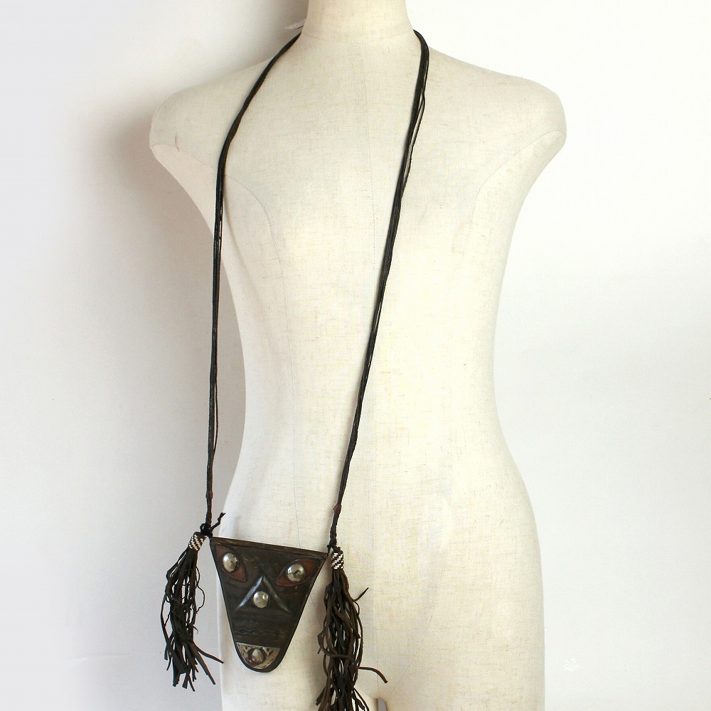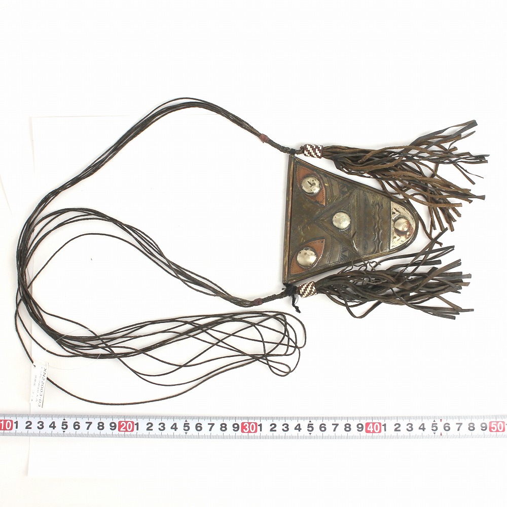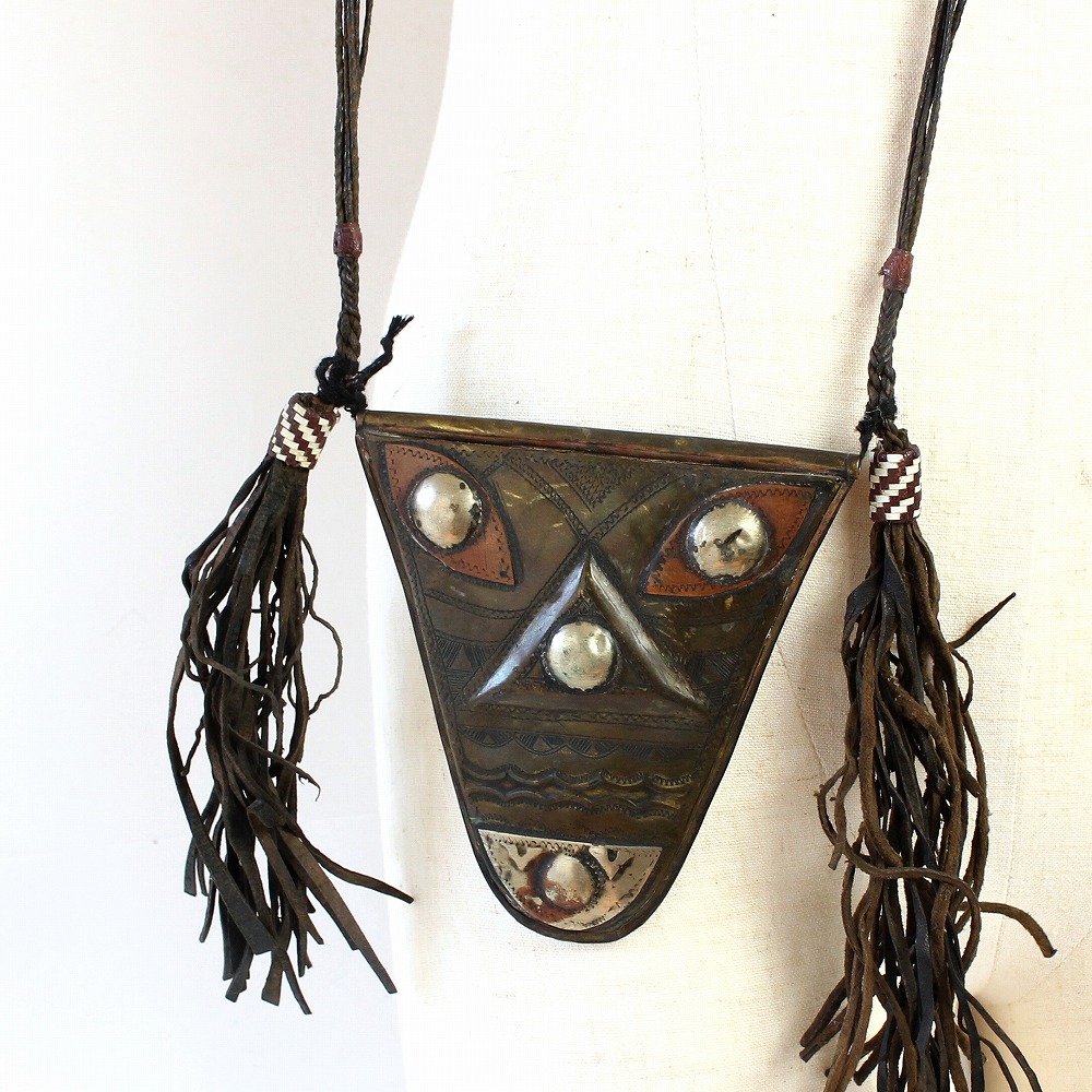 トゥアレグの紋章をデザインしたアンティークのトゥアレグ(トアレグ)ペンダントヘッド(お守り)です。高い工芸技術とデザイン性をもつトゥアレグの人々は、アフリカのサハラ砂漠を支配したベルベル系の遊牧民です。特に砂漠でのコンパスをモチーフとしたトゥアレグ・クロスは、かのエルメスがデザインに取り入れたことで世界的に有名になりました。紋章をかたどったペンダントは、親から子へと代々受け継がれ、出身地や氏族などを示すパスポートとして今なお使われているそうです。これらの手作り品は、「お守り」としての大切な役割もあります。 雄大なサハラ砂漠を活動の場とする遊牧民トゥアレグの、ロマン溢れる工芸品を是非この機会にご覧ください。