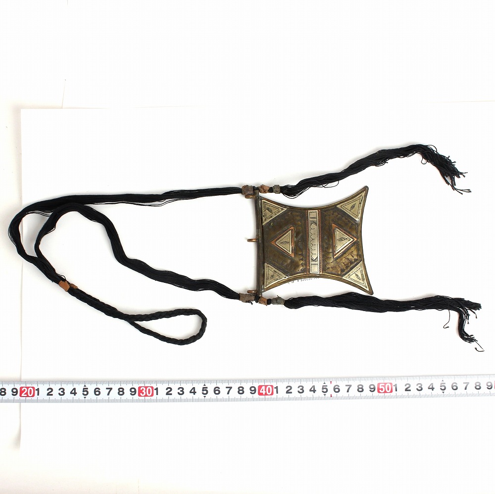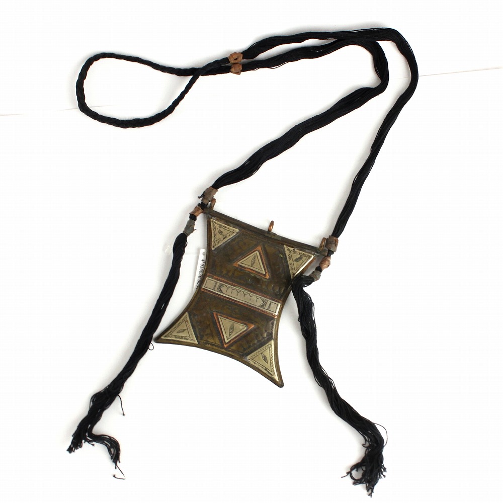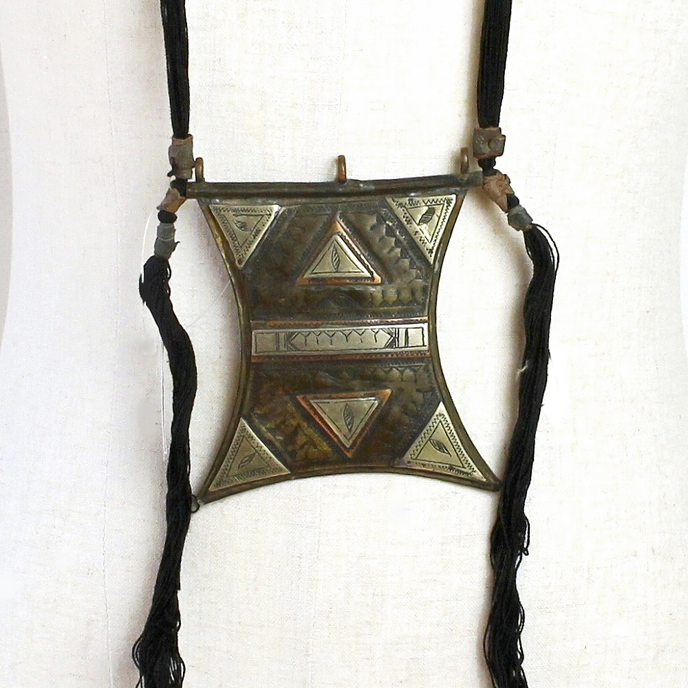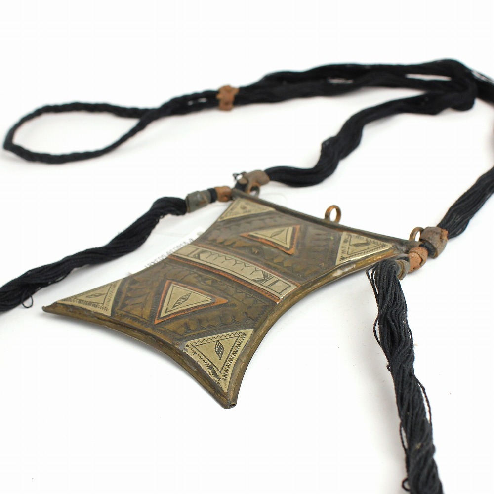 トゥアレグの紋章をデザインしたアンティークのトゥアレグ(トアレグ)ペンダントヘッド(お守り)です。高い工芸技術とデザイン性をもつトゥアレグの人々は、アフリカのサハラ砂漠を支配したベルベル系の遊牧民です。特に砂漠でのコンパスをモチーフとしたトゥアレグ・クロスは、かのエルメスがデザインに取り入れたことで世界的に有名になりました。紋章をかたどったペンダントは、親から子へと代々受け継がれ、出身地や氏族などを示すパスポートとして今なお使われているそうです。これらの手作り品は、「お守り」としての大切な役割もあります。 雄大なサハラ砂漠を活動の場とする遊牧民トゥアレグの、ロマン溢れる工芸品を是非この機会にご覧ください。
