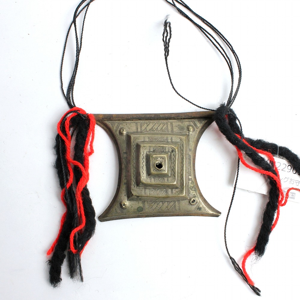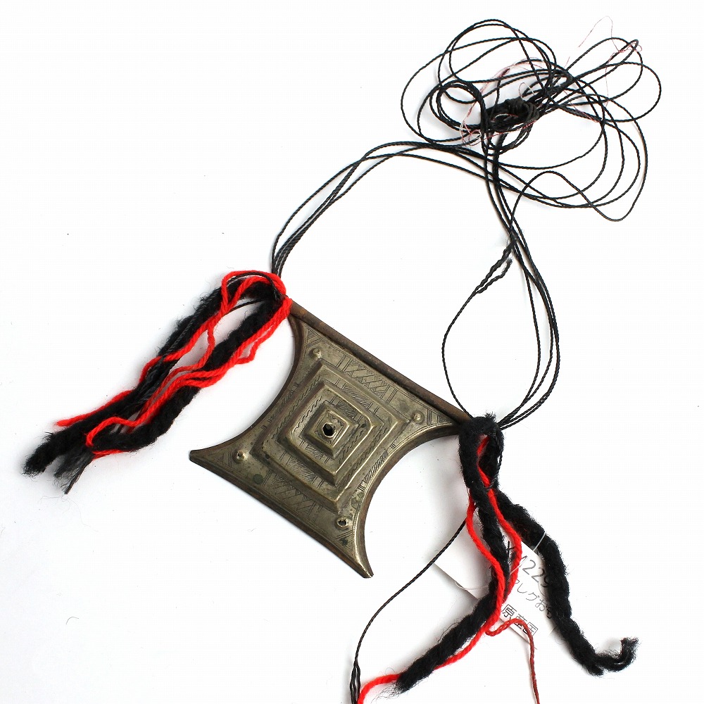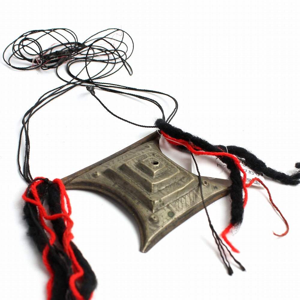 トゥアレグの紋章をデザインしたアンティークのトゥアレグ(トアレグ)ペンダントヘッド(お守り)です。高い工芸技術とデザイン性をもつトゥアレグの人々は、アフリカのサハラ砂漠を支配したベルベル系の遊牧民です。特に砂漠でのコンパスをモチーフとしたトゥアレグ・クロスは、かのエルメスがデザインに取り入れたことで世界的に有名になりました。紋章をかたどったペンダントは、親から子へと代々受け継がれ、出身地や氏族などを示すパスポートとして今なお使われているそうです。これらの手作り品は、「お守り」としての大切な役割もあります。 雄大なサハラ砂漠を活動の場とする遊牧民トゥアレグの、ロマン溢れる工芸品を是非この機会にご覧ください。