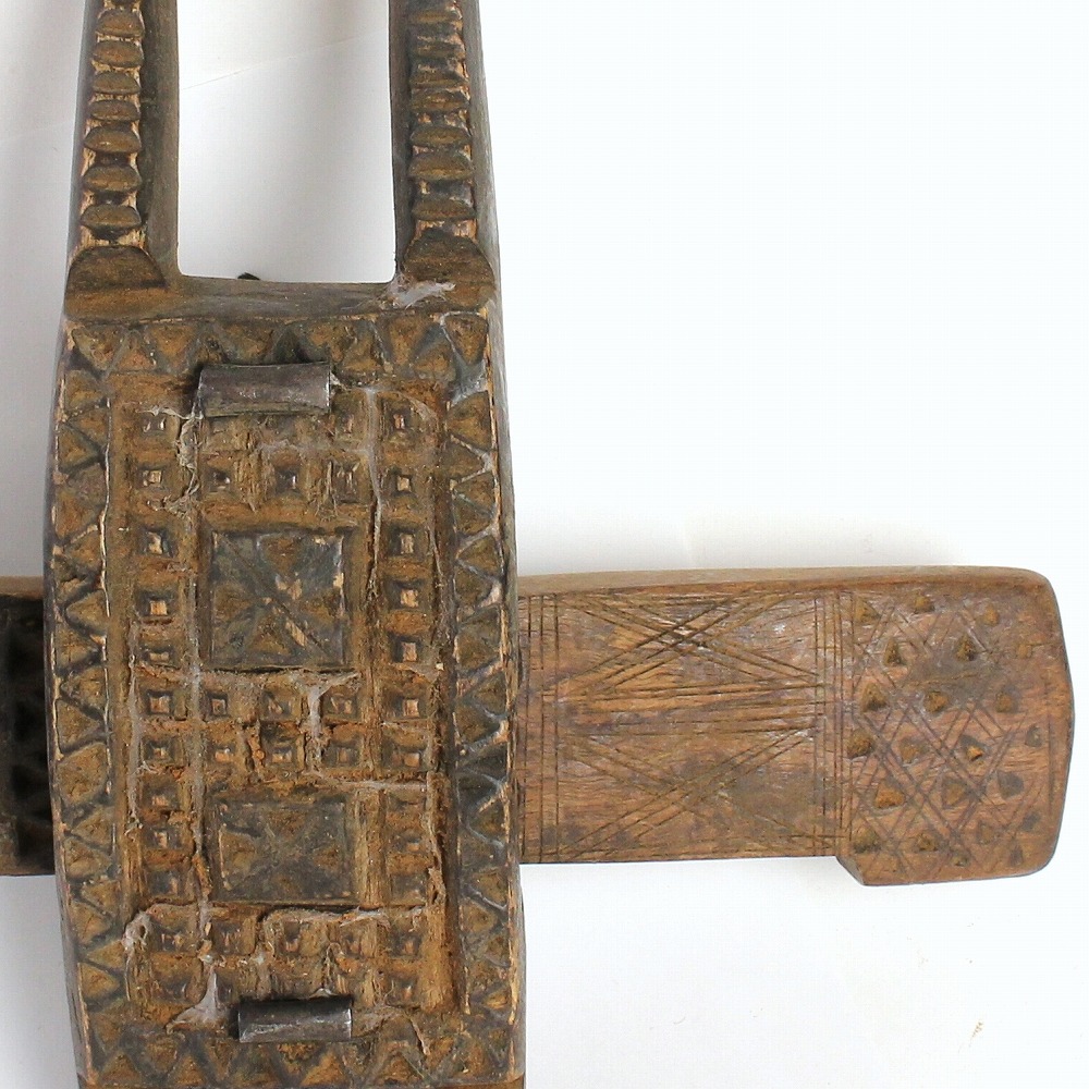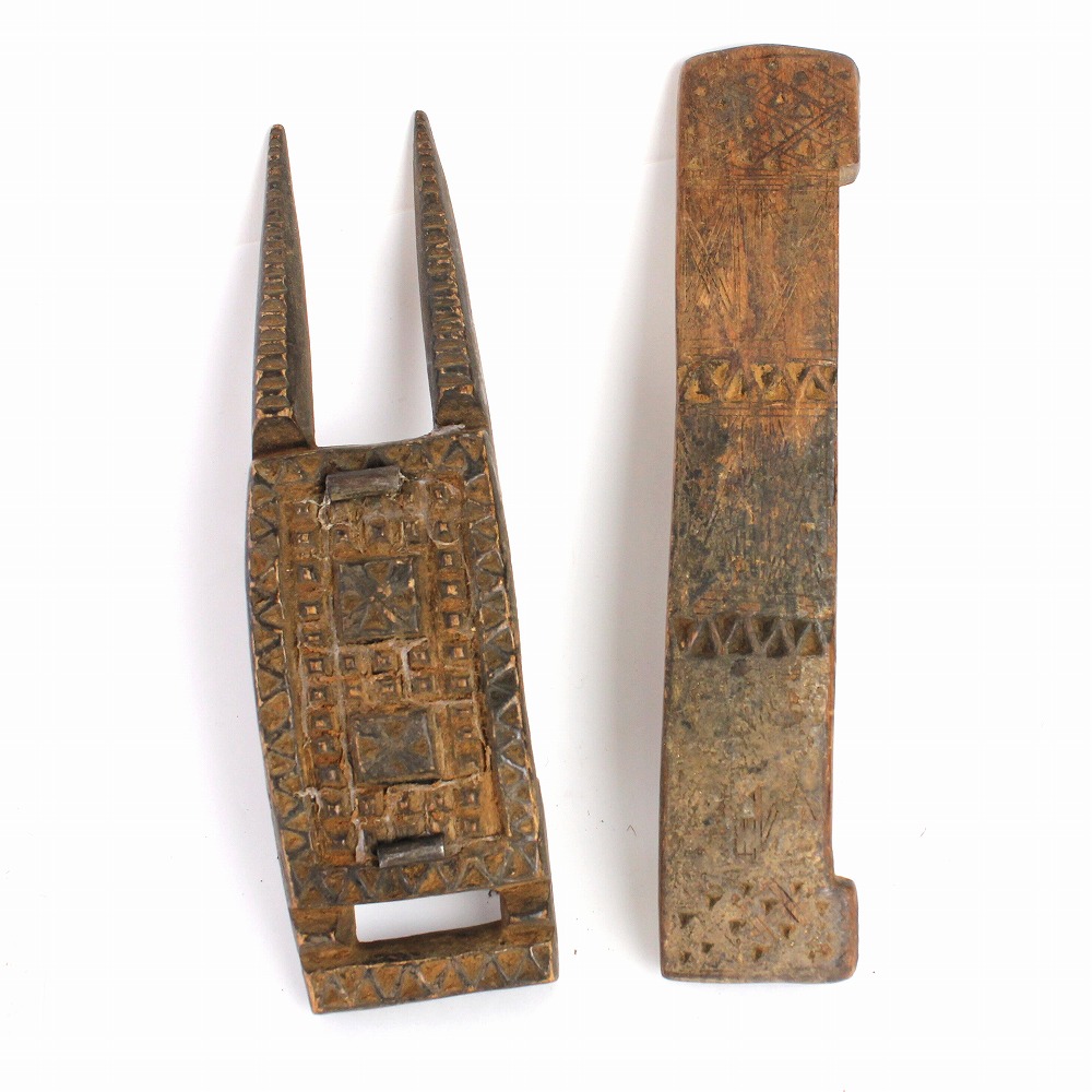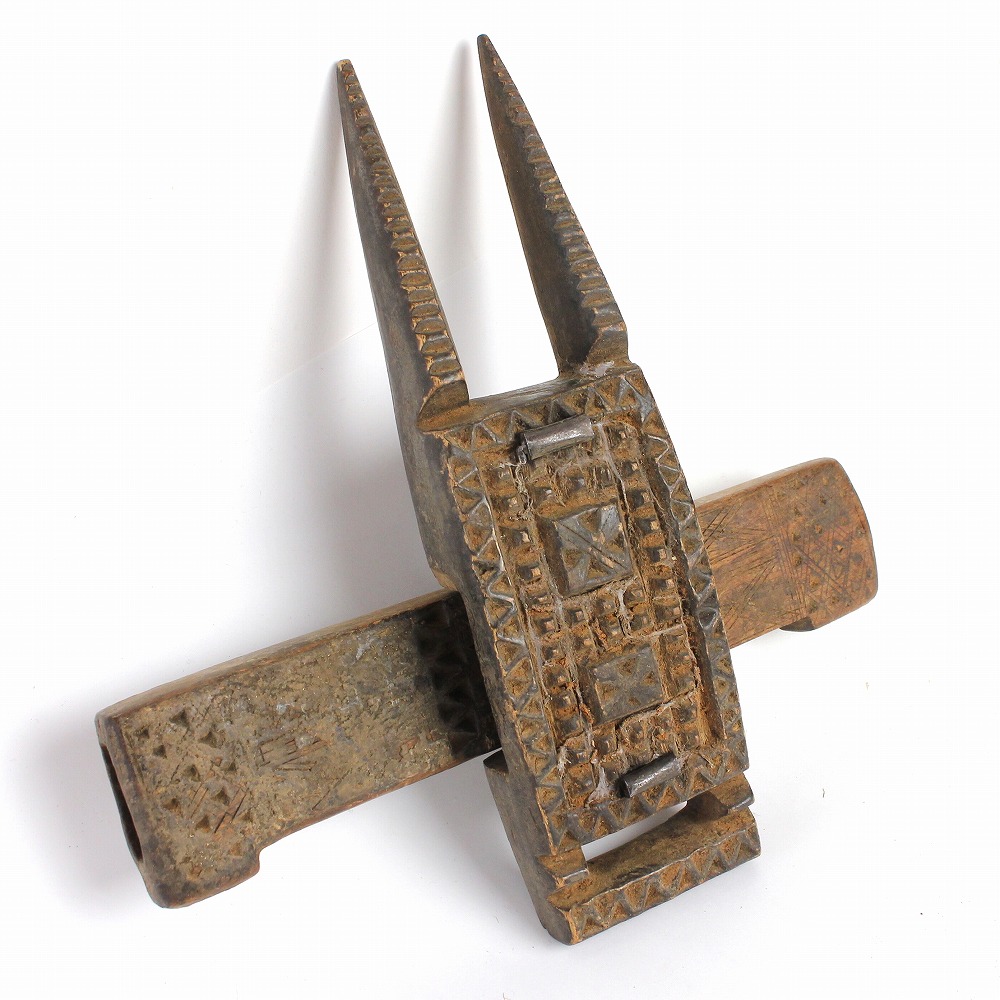 西アフリカ・マリ中央部に住むドゴンの人々が住居や穀物庫の木彫りの扉に取り付けて使用している錠前、ドアロックです。独自の文化をもち、特に天文学に関する知識が豊富で、それに由来する神話が多く存在します。その神話に登場する動物や祖先を表す人物など様々なモチーフが彫刻されたドアロックは、災いから自分たちを守る役割をもっていたとされています。