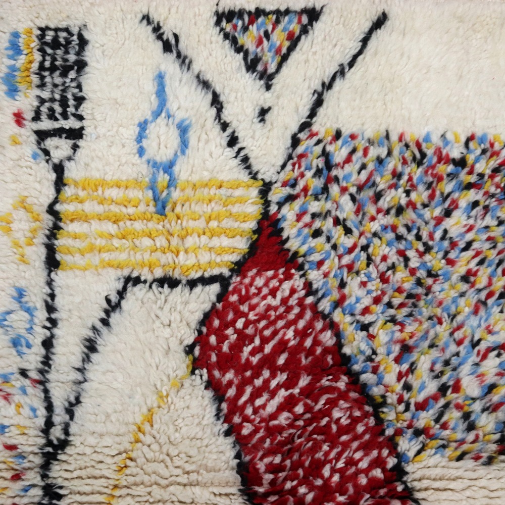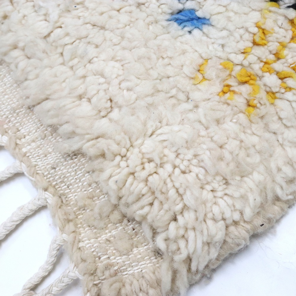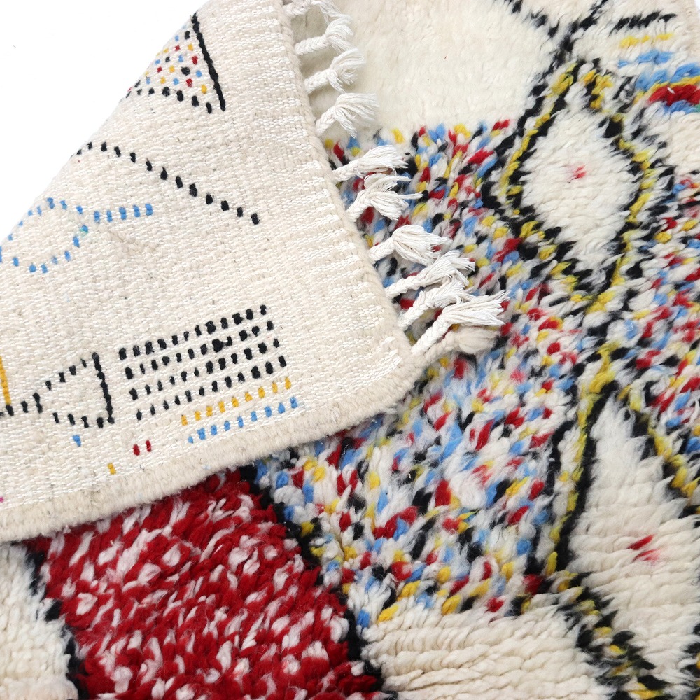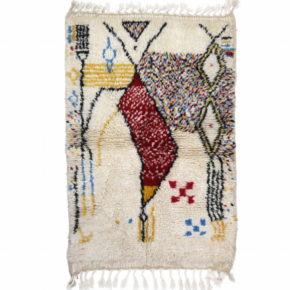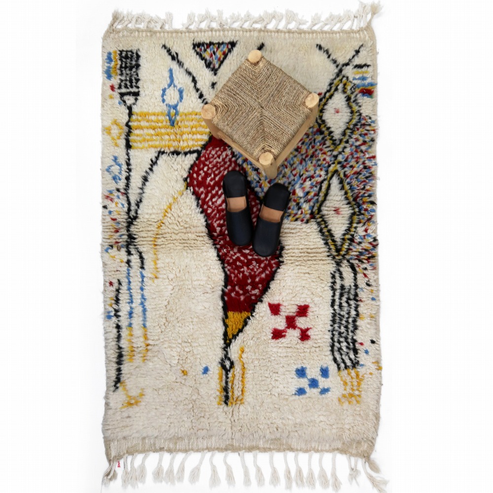 ワッザン地方で作られている絨毯、厚手タイプ一点物です。オフホワイトのベースに、カラフルで象徴的なモチーフを織り込んだ洗練されたデザイン。鮮やかで大胆な色使いも魅力的です。羊毛ラグは、冬暖かく夏は素足に気持ちよく、オールシーズン活躍します。贅沢な風合いをお楽しみください。リビングやお部屋のポイントに、本物ならではの存在感をお楽しみください。