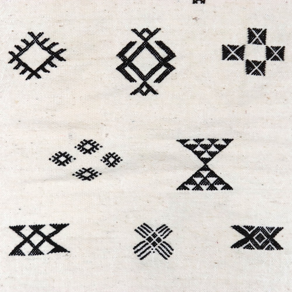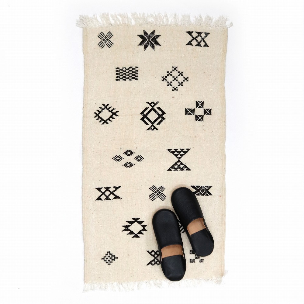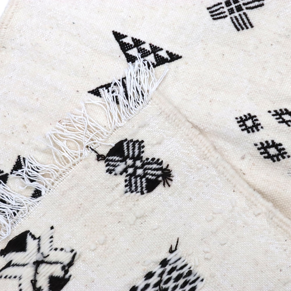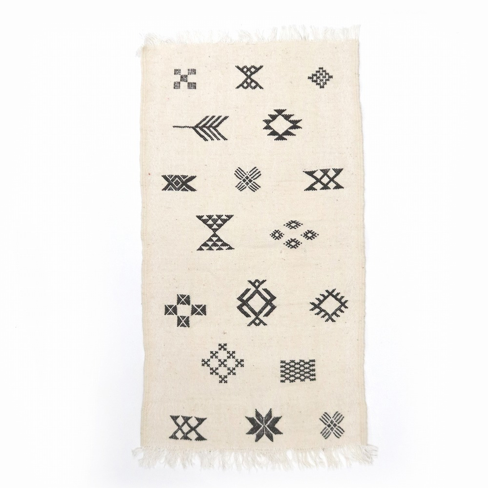 ワッザン地方で作られている絨毯、薄手タイプ一点物です。オフホワイトのベースに、黒糸で象徴的なモチーフを織り込んだ洗練されたデザイン。モノトーンのシンプルなデザインが魅力的です。薄手の羊毛ラグは、冬暖かく夏は素足に気持ちよく、オールシーズン活躍します。リビングやお部屋のポイントに、タペストリーとしても広くお使いいただけます。本物ならではの存在感をお楽しみください。