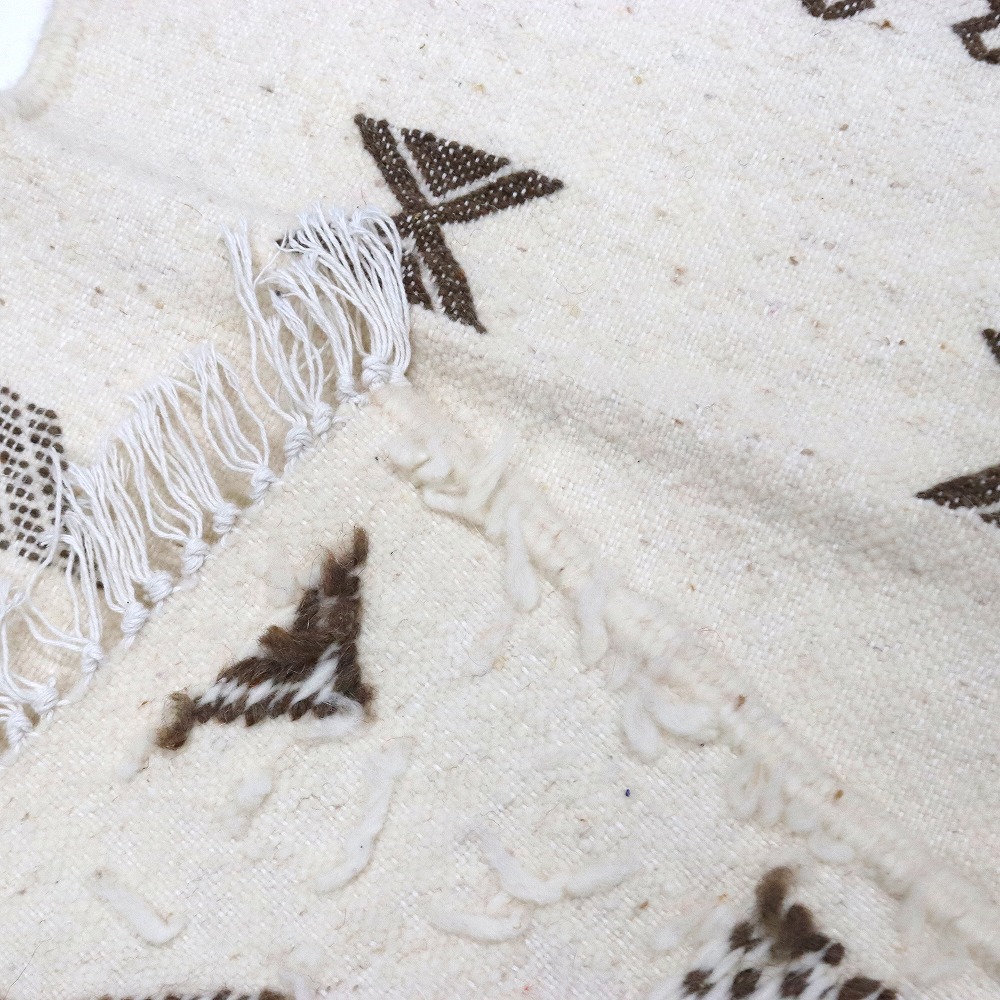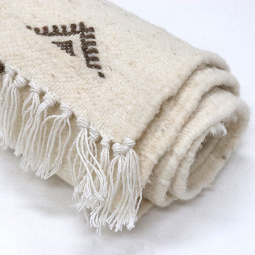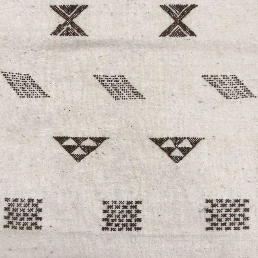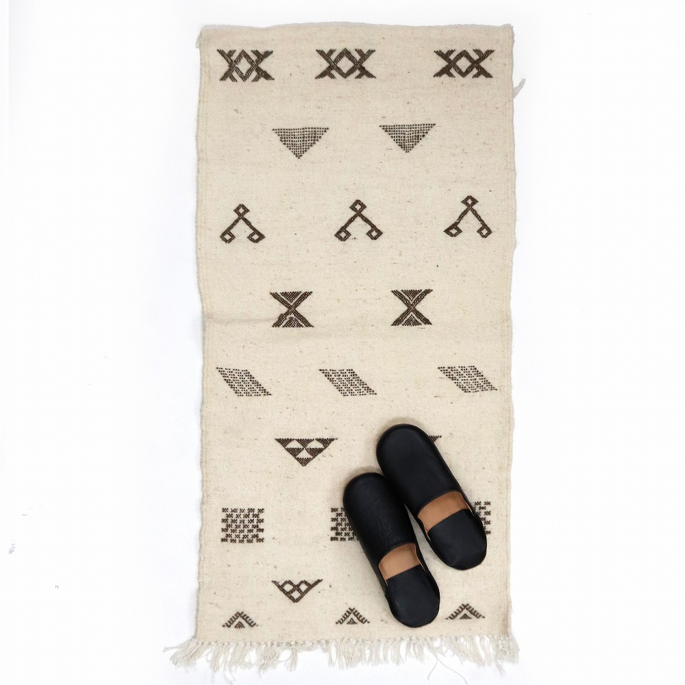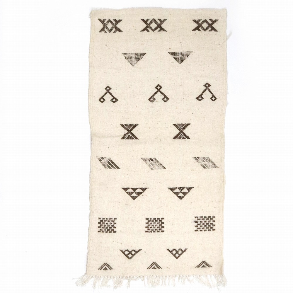 ワッザン地方で作られている絨毯、薄手タイプ一点物です。オフホワイトのベースに、黒糸で象徴的なモチーフを織り込んだ洗練されたデザイン。モノトーンのシンプルなデザインが魅力的です。薄手の羊毛ラグは、冬暖かく夏は素足に気持ちよく、オールシーズン活躍します。リビングやお部屋のポイントに、タペストリーとしても広くお使いいただけます。本物ならではの存在感をお楽しみください。