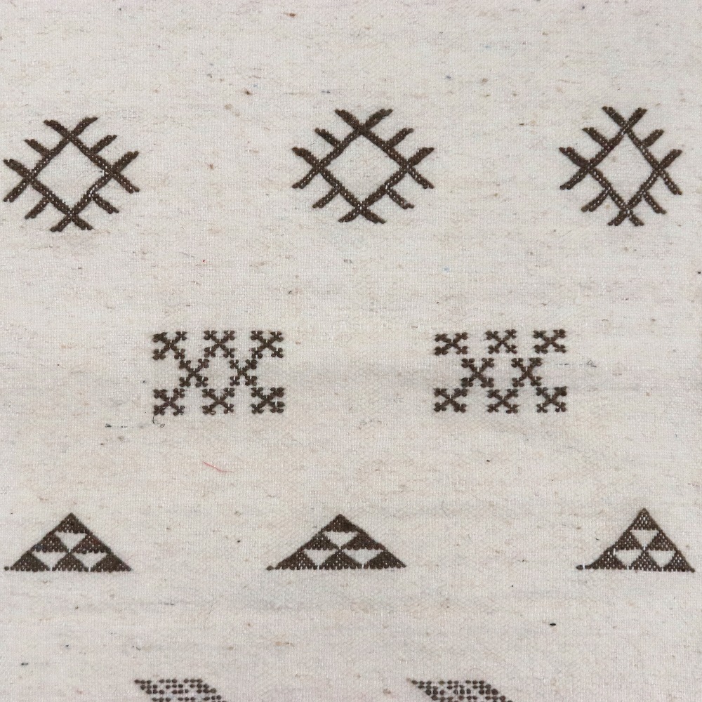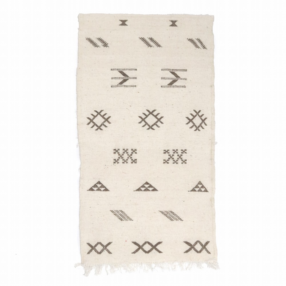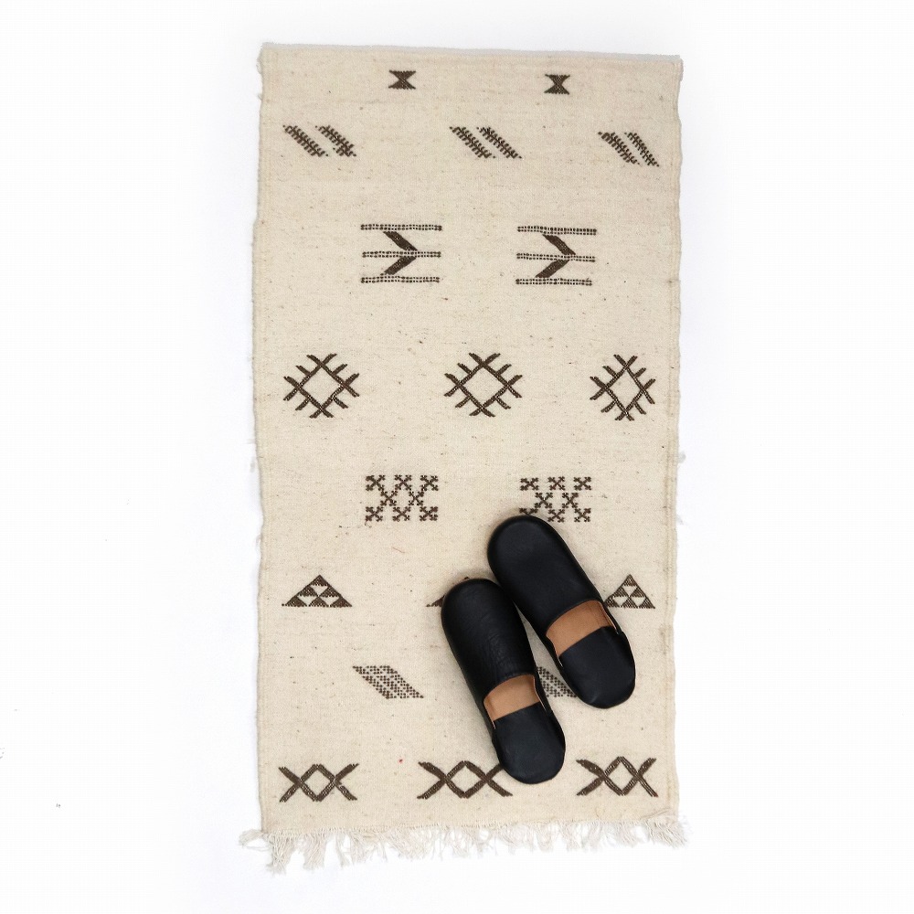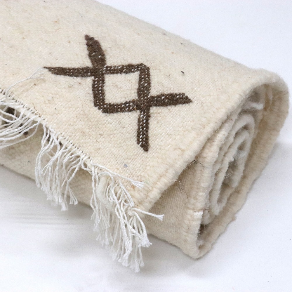 ワッザン地方で作られている絨毯、薄手タイプ一点物です。オフホワイトのベースに、黒糸で象徴的なモチーフを織り込んだ洗練されたデザイン。モノトーンのシンプルなデザインが魅力的です。薄手の羊毛ラグは、冬暖かく夏は素足に気持ちよく、オールシーズン活躍します。リビングやお部屋のポイントに、タペストリーとしても広くお使いいただけます。本物ならではの存在感をお楽しみください。