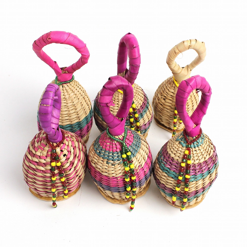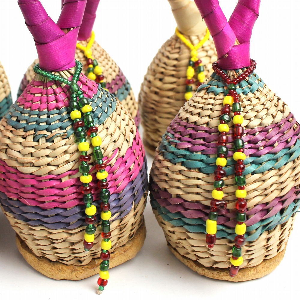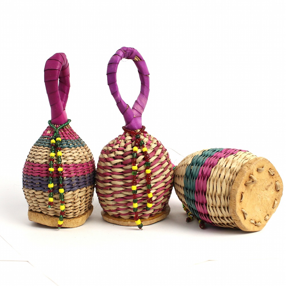 手のひらサイズが使いやすい、水草を編み上げ、ビーズで装飾したガラガラです。カゴの中に、金属片や響きのよい小石が入っていています。底は丸くカットしたひょうたんが編み込まれています、優しく心地よい音、自然の音が和みます。南米ででは「カシシ」とも呼ばれているシェーカー。本体は軽くて持ちやすいので、お子様から本格的に演奏されている方までお使いいただけます。