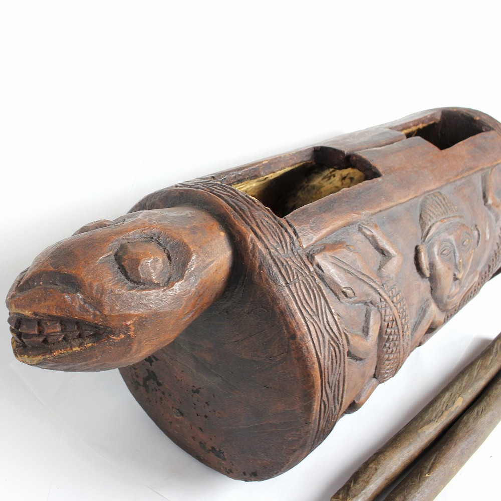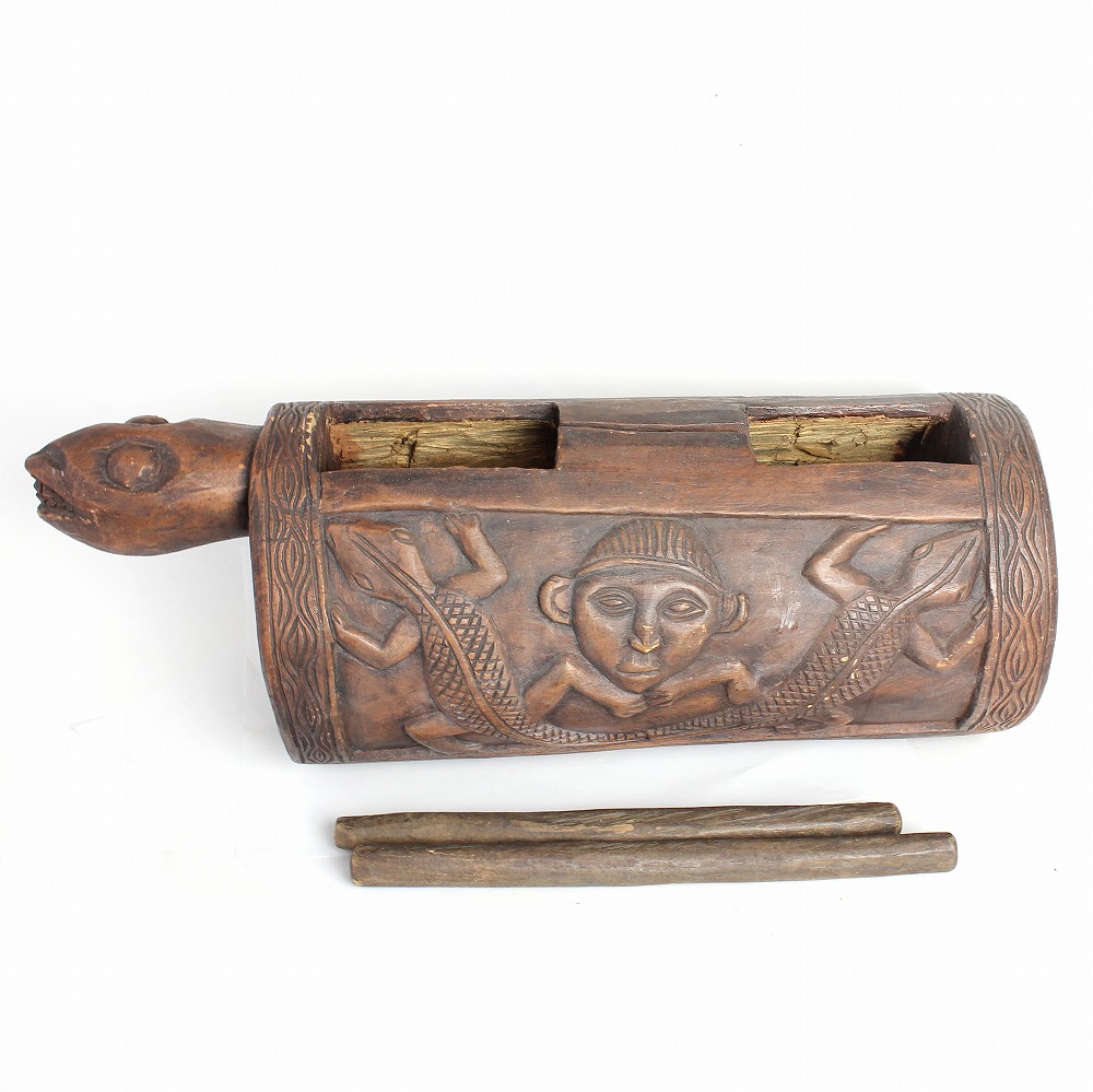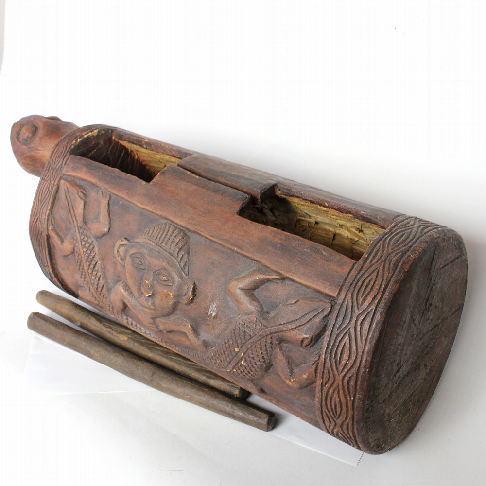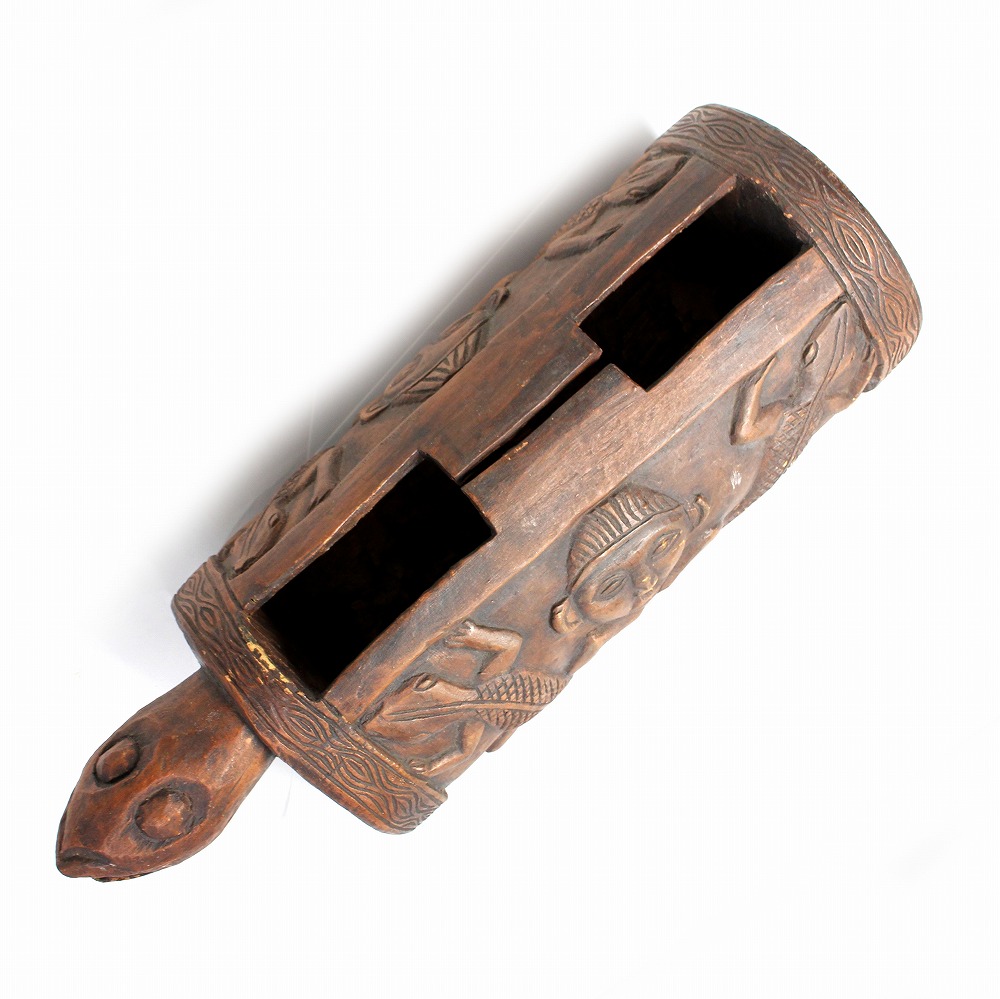 木をくりぬいて作られたカメルーンのスリットゴング、割れ目タイコです。装飾も美しく、迫力あるプリミティブな音色を楽しめます。スティック付き