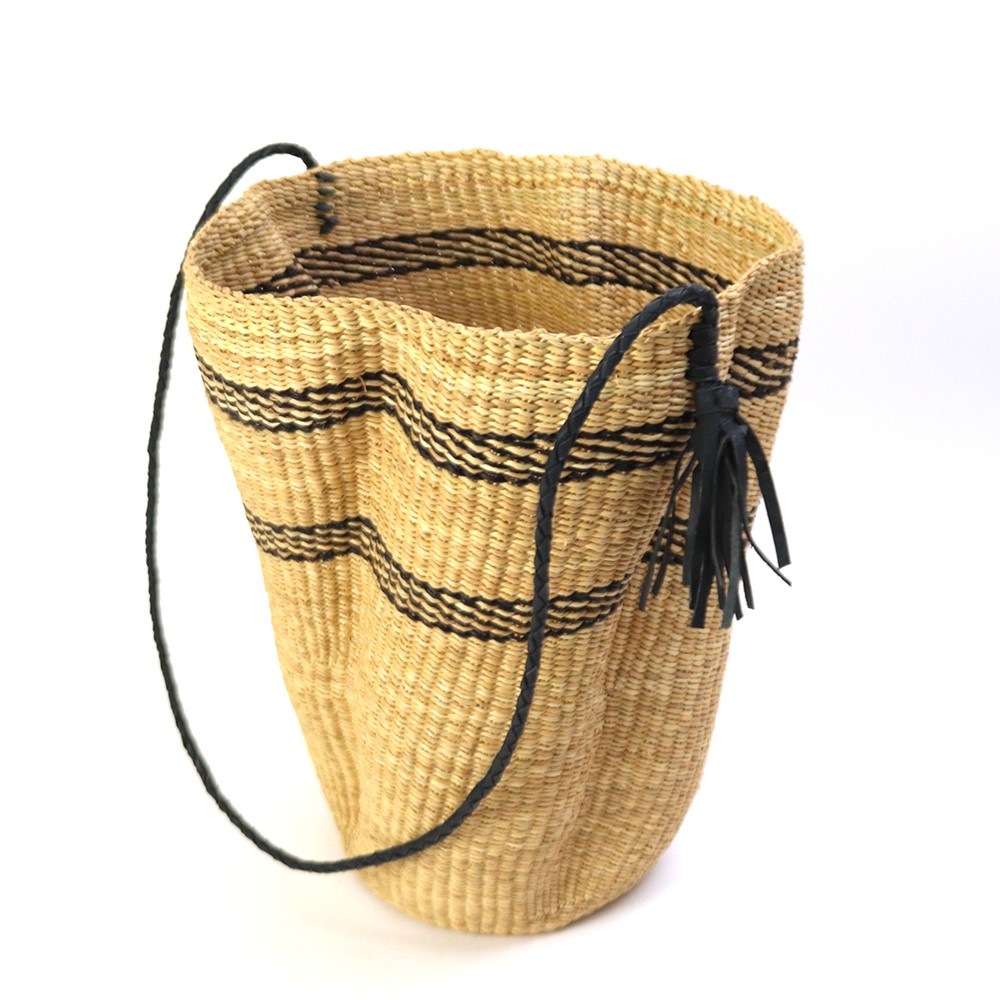 【受注商品】ボルガ縦長丸底ウェイブショルダーカゴ 柄入り ナチュラル黒 黒革