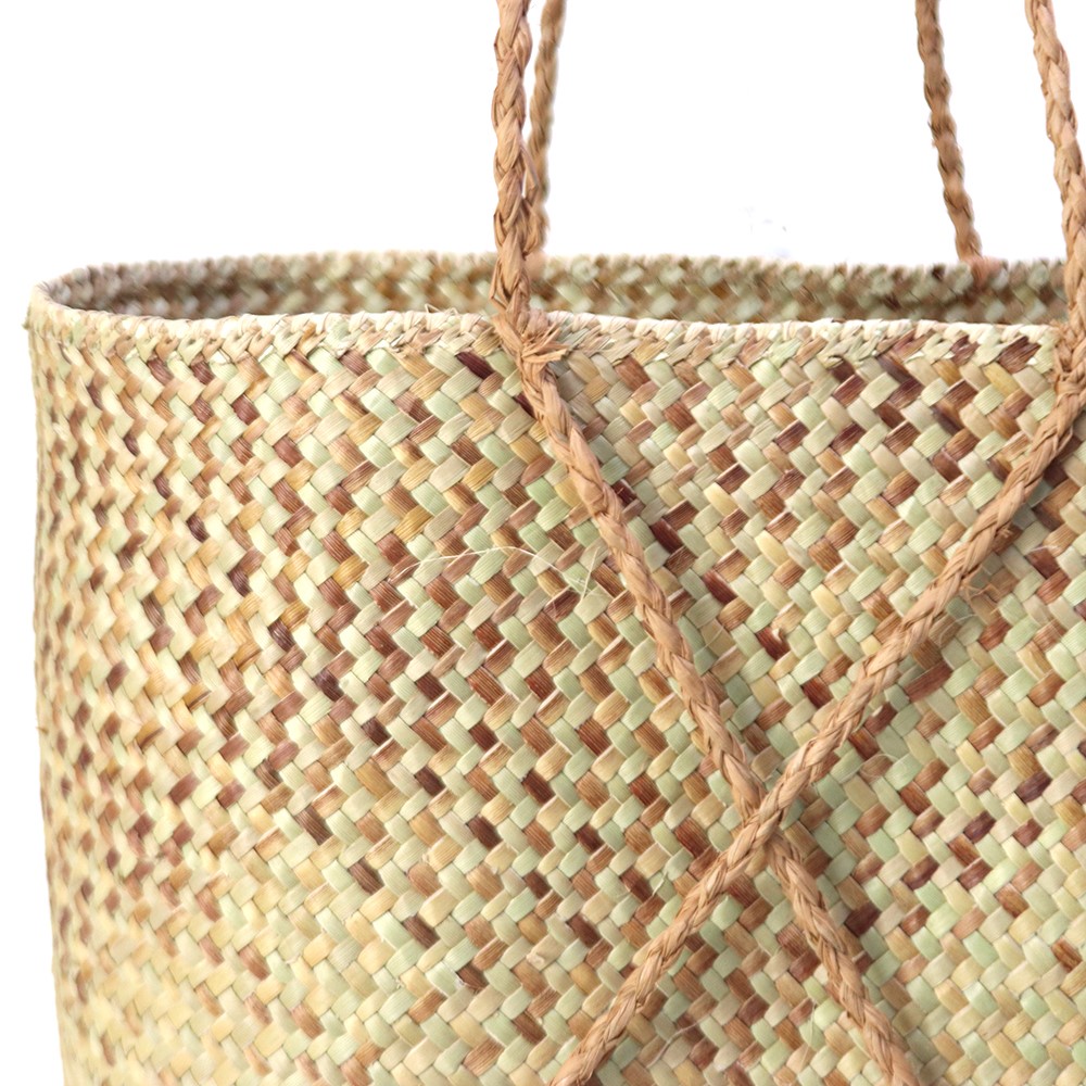 エラナと呼ばれる水草で編んだナチュラルな風合いのカゴバッグです。自然の色が美しく、少しくたっとした柔らかさもあり雰囲気ある素材です。マルシェタイプなので、お買い物やインテリアバスケットとして活躍しそうです。