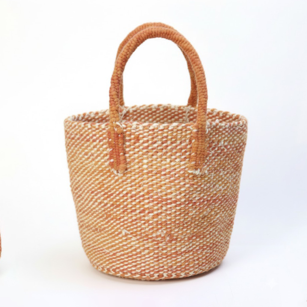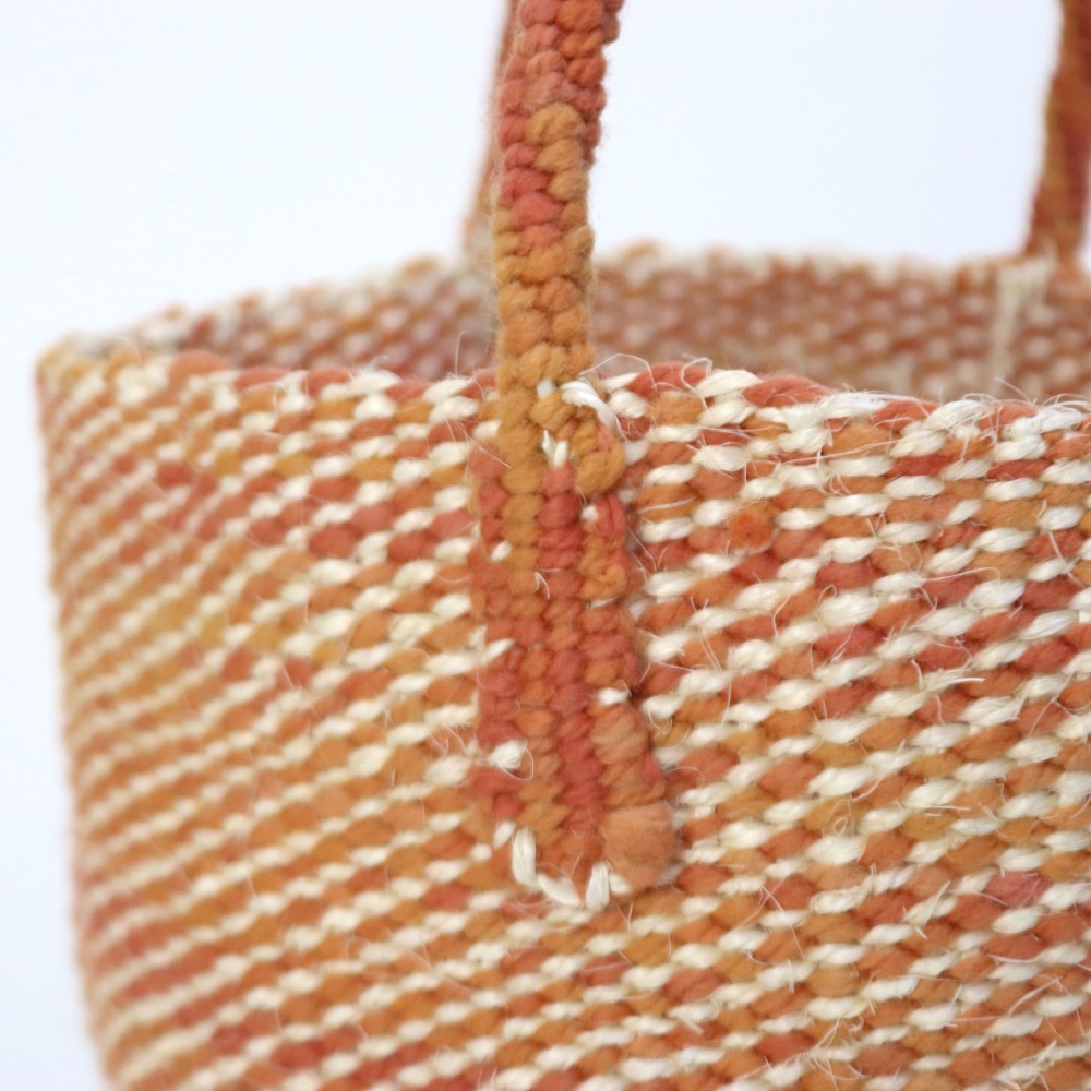 サイザル麻とビーツで染めたケナナウールの柔らかい色味の毛糸をミックスして編んだやさしい色味が魅力のサイザルバッグ。サイザル麻を芯にして、草木染された毛糸を編みこんであるので丈夫です。ちょっとお出掛けするのにちょうどよいサイズ感のミニバッグです。