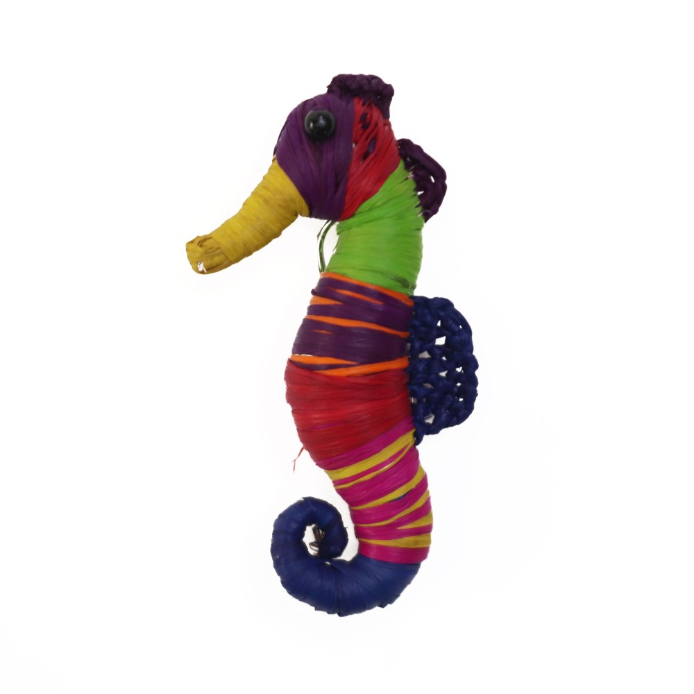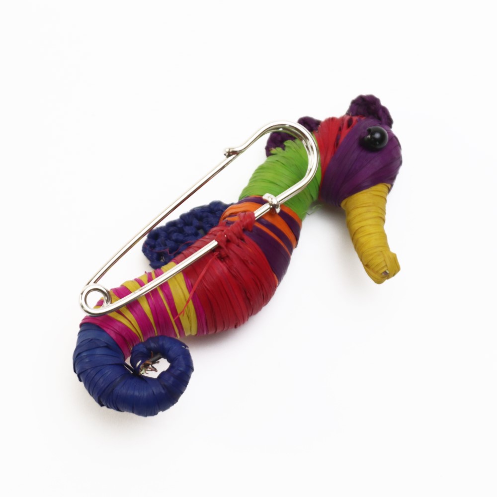 カラフルなマダガスカルラフィア製のタツノオトシゴブローチです。大小2タイプ、色柄アソートです。
