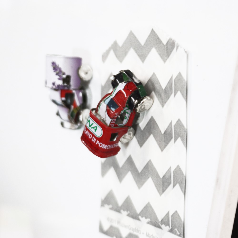 空き缶リサイクルしたマグネット付自動車です。冷蔵庫や、鉄製棚に飾っても素敵です。プレゼントにも喜ばれます。柄はアソートです。
