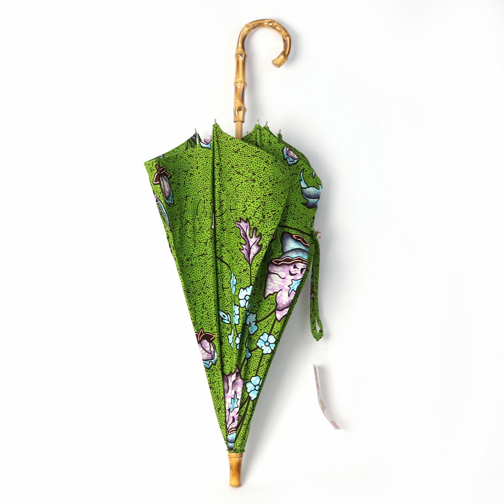 選りすぐりのパーニュ布を折りたたみのカラフルなプリント日傘に仕立てました。石突もハンドルに合わせて竹を使用。よりお洒落になりました。生地の組み合わせ方や止め具のアフリカンビーズなど、細部にまでこだわって作った逸品です。安全ろくろのため手を挟まずに開くことができます。撥水加工を施していますので多少の雨には対応できますが、雨傘ほどの完全な撥水力を持つ製品ではございません。日傘としての使用を推奨しております。UVカット率90%以上。(未使用時)