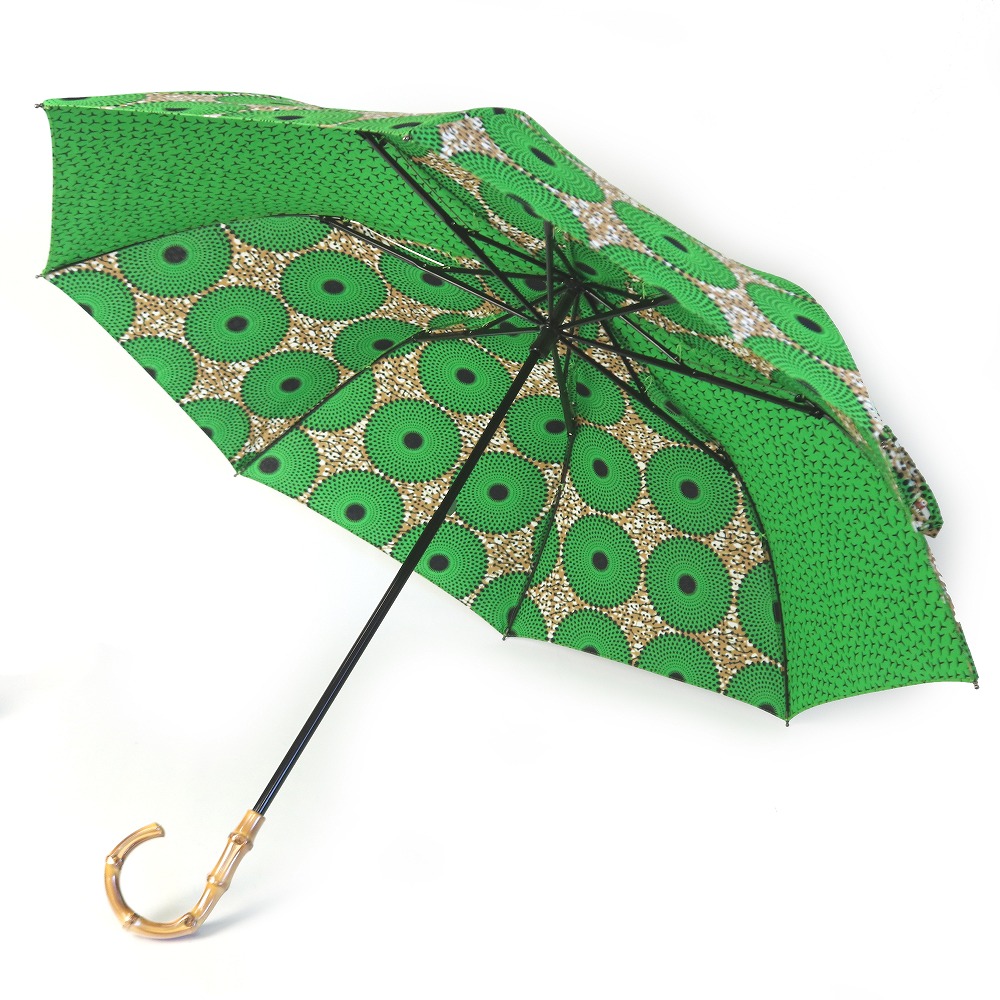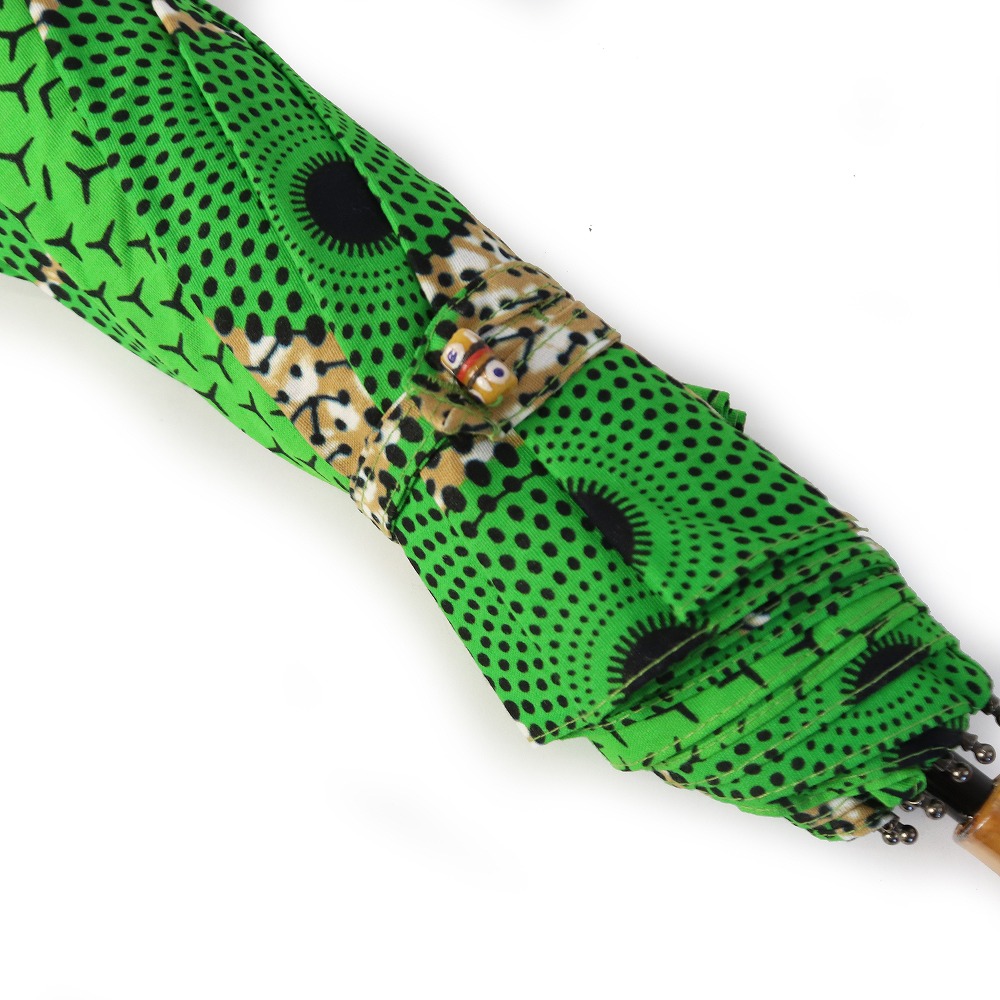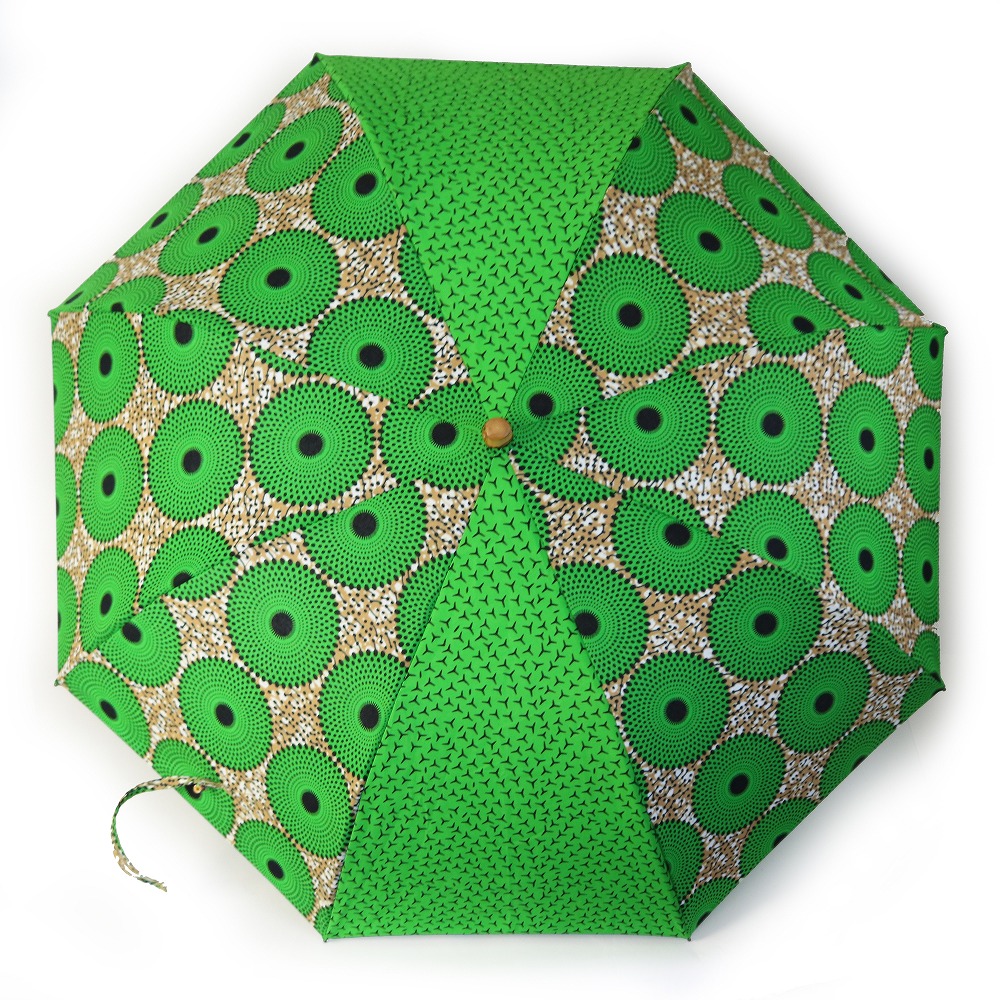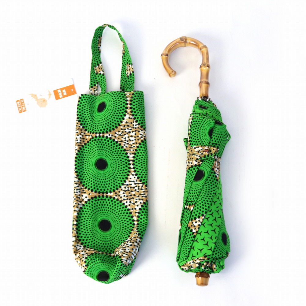 選りすぐりのパーニュ布を折りたたみのカラフルなプリント日傘に仕立てました。石突もハンドルに合わせて竹を使用。よりお洒落になりました。生地の組み合わせ方や止め具のアフリカンビーズなど、細部にまでこだわって作った逸品です。安全ろくろのため手を挟まずに開くことができます。撥水加工を施していますので多少の雨には対応できますが、雨傘ほどの完全な撥水力を持つ製品ではございません。日傘としての使用を推奨しております。UVカット率90%以上。(未使用時)