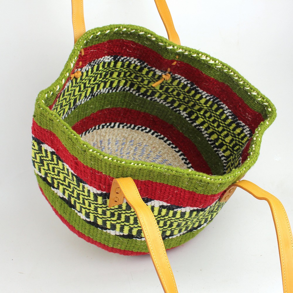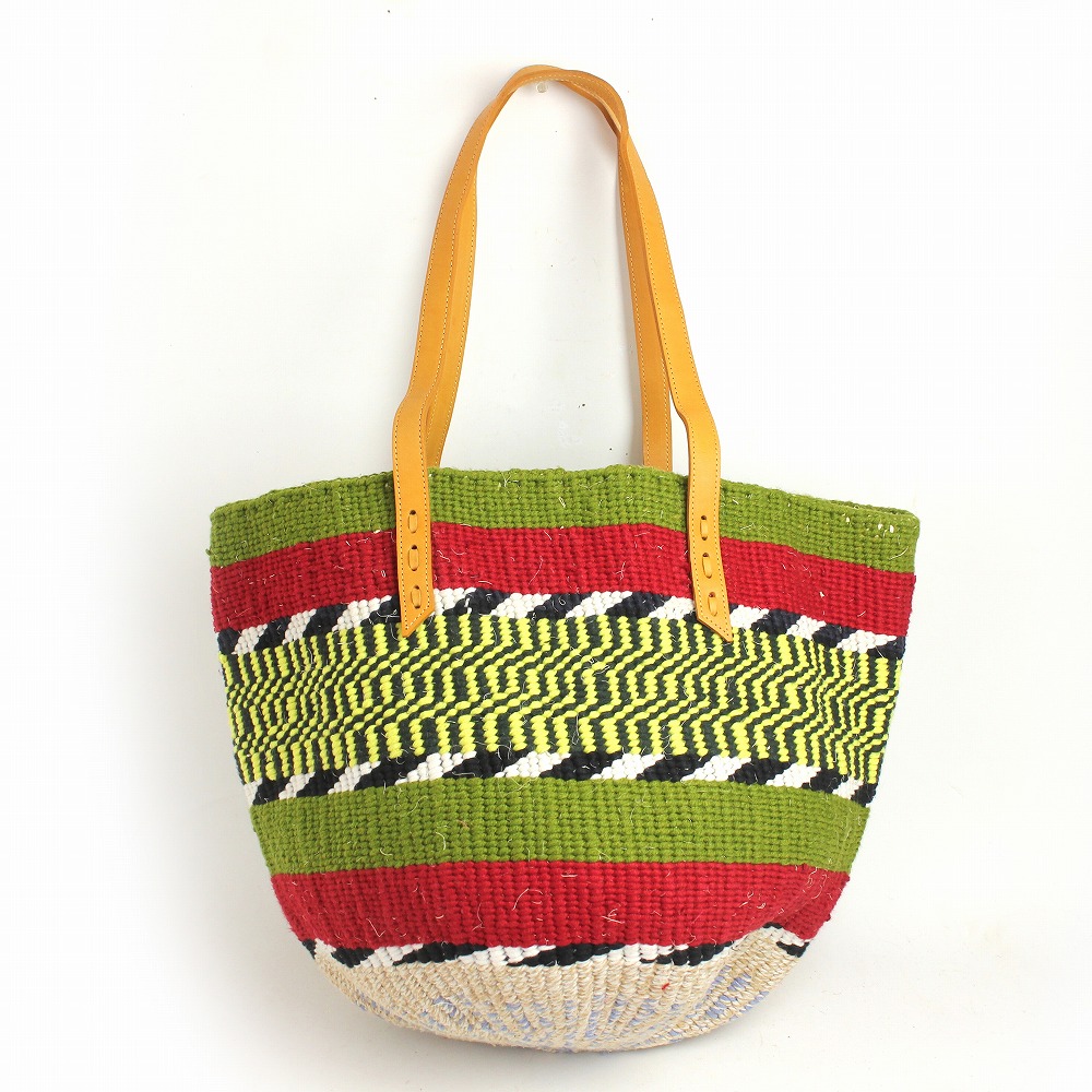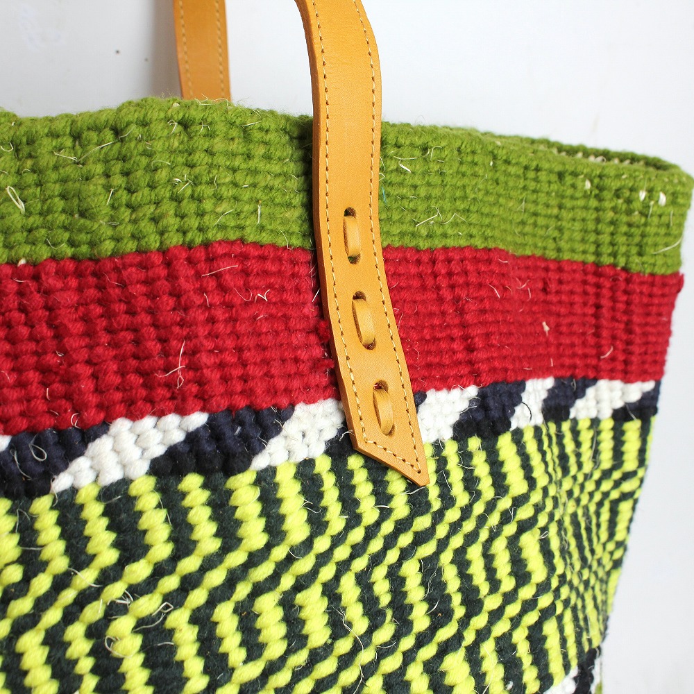 オールシーズン使えるショルダータイプのアクリルサイザルバッグです。平革ハンドルがポイント。サイザルとアクリルを合わせることでふんわりした質感が楽しめます。カラフルな色遣いと柄で3シーズン使える人気のカゴバッグです。丸底大きめなので、物もたくさん入ります。お出かけに通勤通学に、使わない時はインテリアバスケットとしても使える便利なカゴバッグです。こちらの商品は一点ものです。