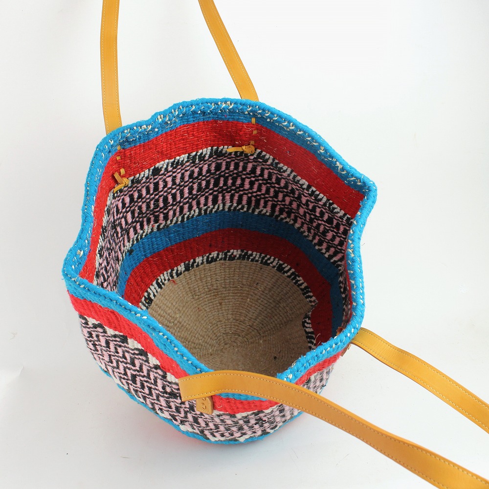 オールシーズン使えるショルダータイプのアクリルサイザルバッグです。平革ハンドルがポイント。サイザルとアクリルを合わせることでふんわりした質感が楽しめます。カラフルな色遣いと柄で3シーズン使える人気のカゴバッグです。丸底大きめなので、物もたくさん入ります。お出かけに通勤通学に、使わない時はインテリアバスケットとしても使える便利なカゴバッグです。こちらの商品は一点ものです。
