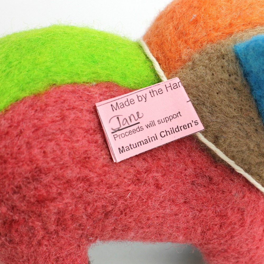 カラフルな色合いとまるっこい形が温かみのある、羊毛フェルト製のゾウのぬいぐるみです。愛嬌のある表情、抱きしめたときの羊毛フェルトの風合いが実に癒されるます。ケニア、マトマイニの自立支援施設にある職業訓練工房の卒業生や、施設近所のスラムに住むシングルマザーたちの自立支援目的として、元気に作品を生み出しています。羊毛フェルトをチクチクと刺し固めてフェルト化していく工程は、時間と根気が必要な大変な作業ですが、細部にわたり丁寧に作られています。一度にたくさんはできませんが、一つ一つに心がこもった、素敵な作品です。お子様やクリスマスのプレゼントにもどうぞ。