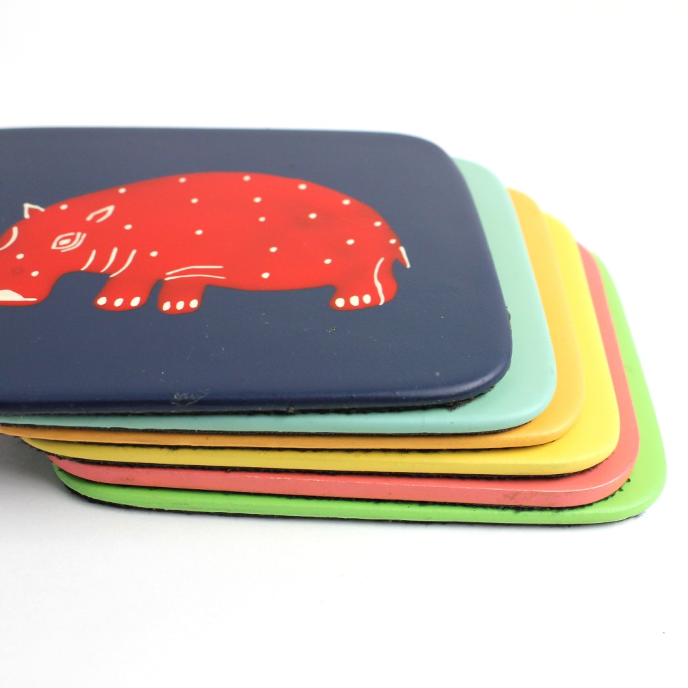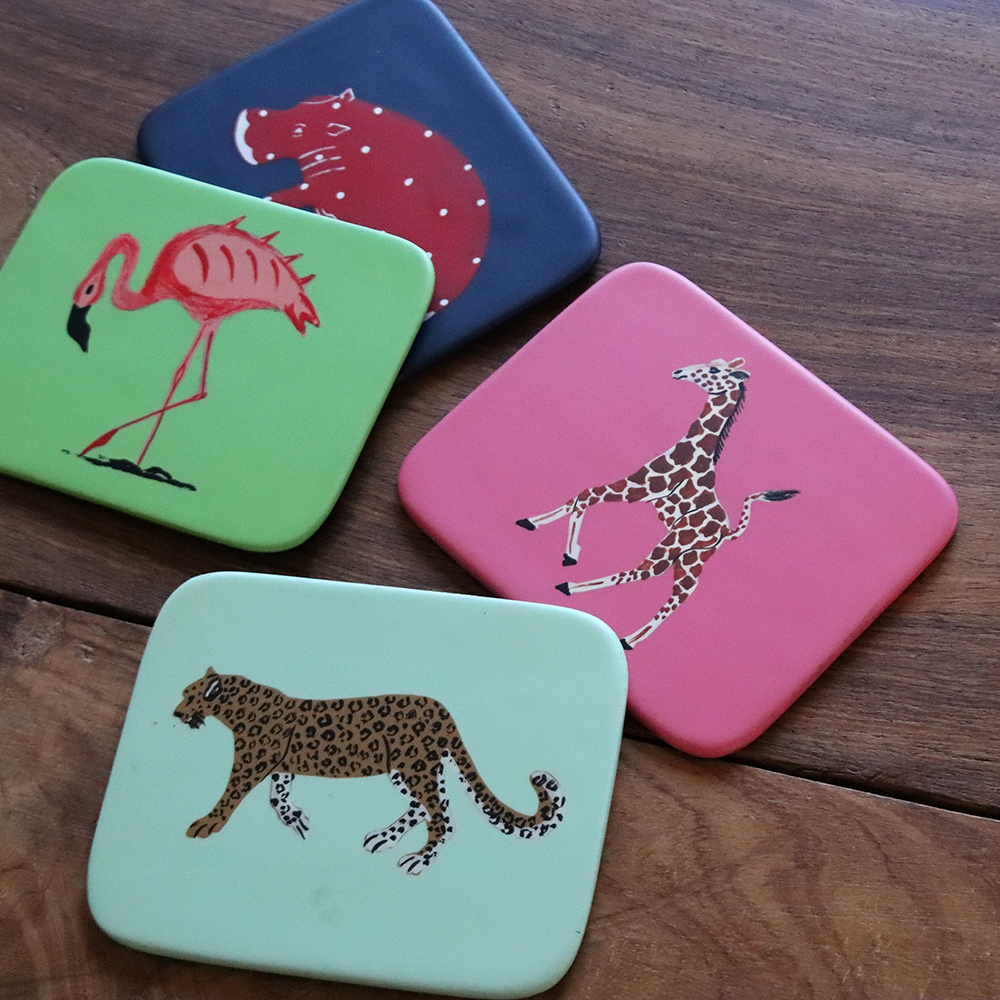 洗練されたデザインが魅力的な木製のコースターです。鮮やかな色合い、アフリカンな動物柄で、テーブルを楽しく演出します。