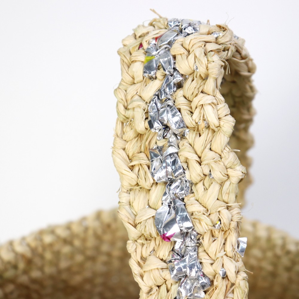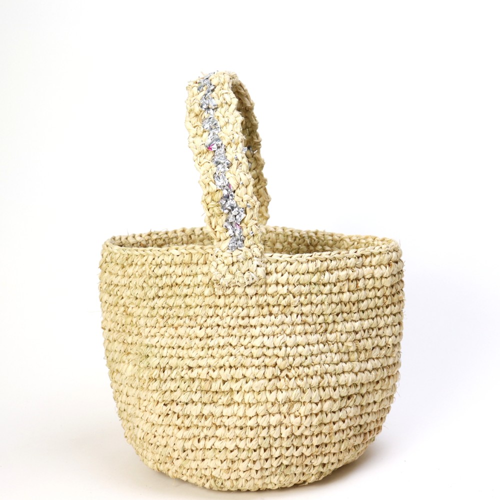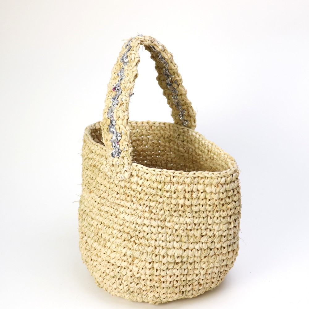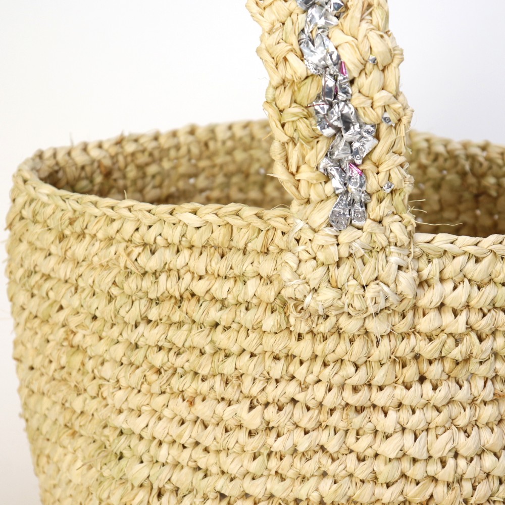 ラフィアのカギ編みバッグにとプラ素材を編み込んだワンハンドルのバッグです。ラフィアにシルバー素材を合わせることでよりスタイリッシュな印象に仕上がりました。お出かけに通勤通学に。