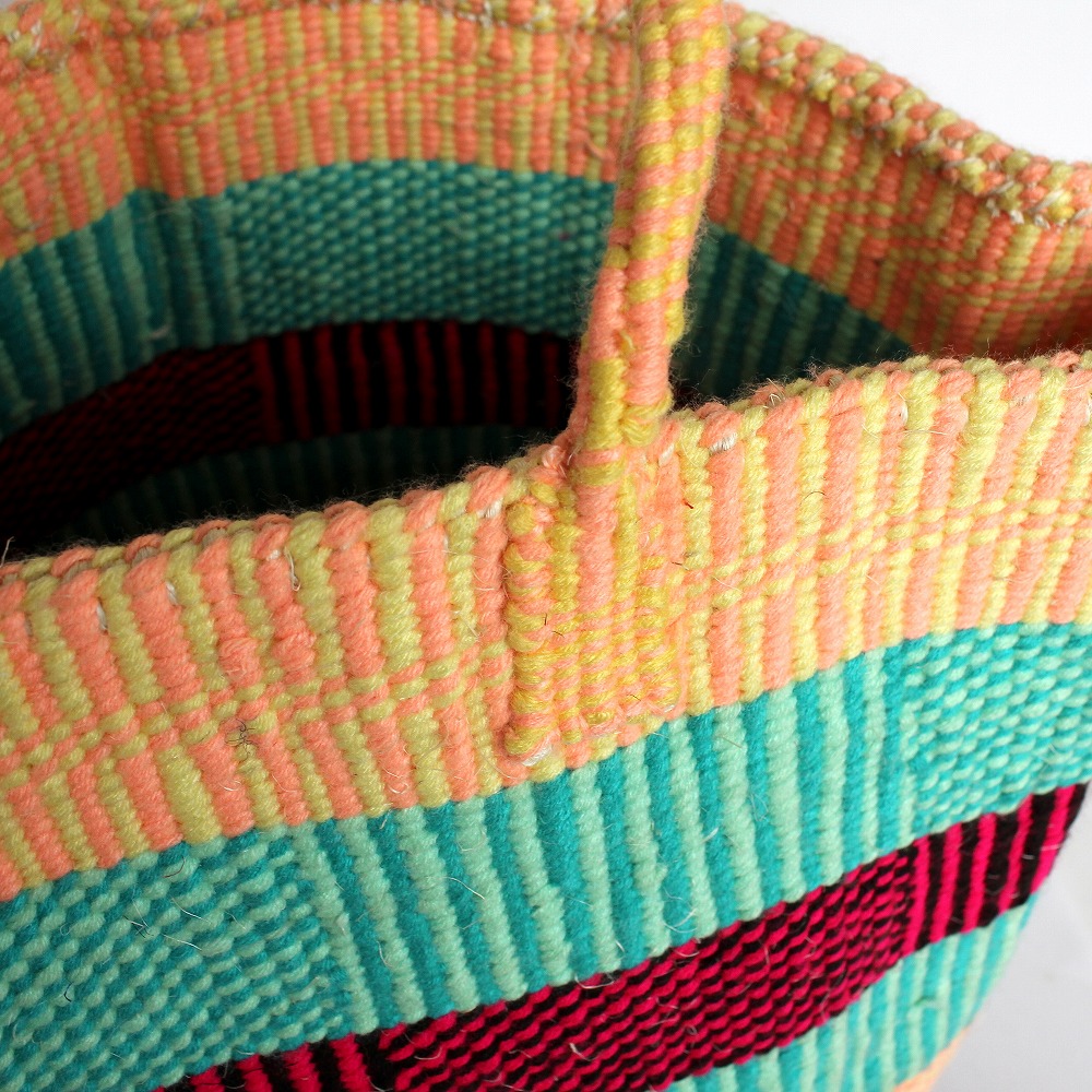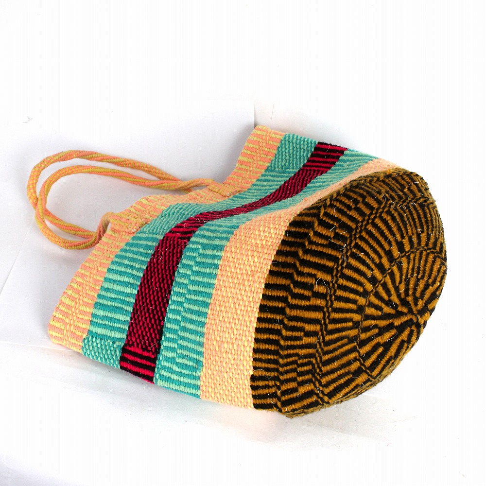 通常のかごを編んだときに少し余ってしまうアクリル糸とカラフルなサイザルで編み上げた、デザイン性の高いアップサイクルアクリルバッグ12x11インチです。アクリルサイザルとは、サイザル麻を芯にしてカラフルなアクリル毛糸を編み込んだカゴバッグです。大き目サイズ、持ち手部分も毛糸を編み込んでいるので、ふんわり持ちやすく、オールシーズン活躍するカゴバッグです。アイディアを加えることで付加価値の高いモノに生まれ変わらせるサスティナブルな試みです。世界に一つしかない価値ある「アップサイクルサイザルバッグ」いかがでしょうか?