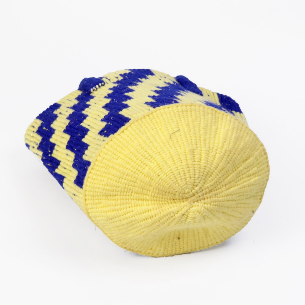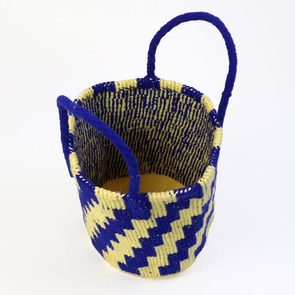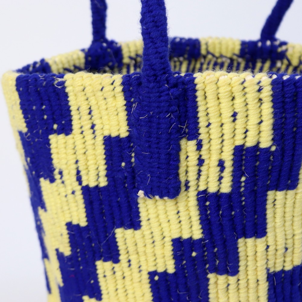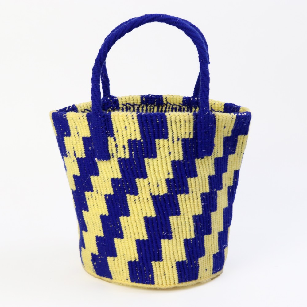 サイザル麻に発色の良いアクリル糸を組み合わせ、階段状の柄を描いたかごバッグ。規則的なモチーフと鮮やかな配色が、シンプルな装いのアクセントに。天然素材の素朴さと、色の軽やかさが共存する一点です。