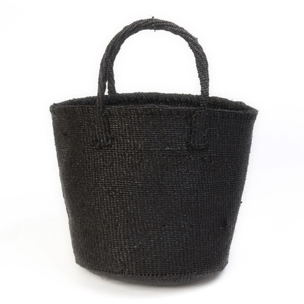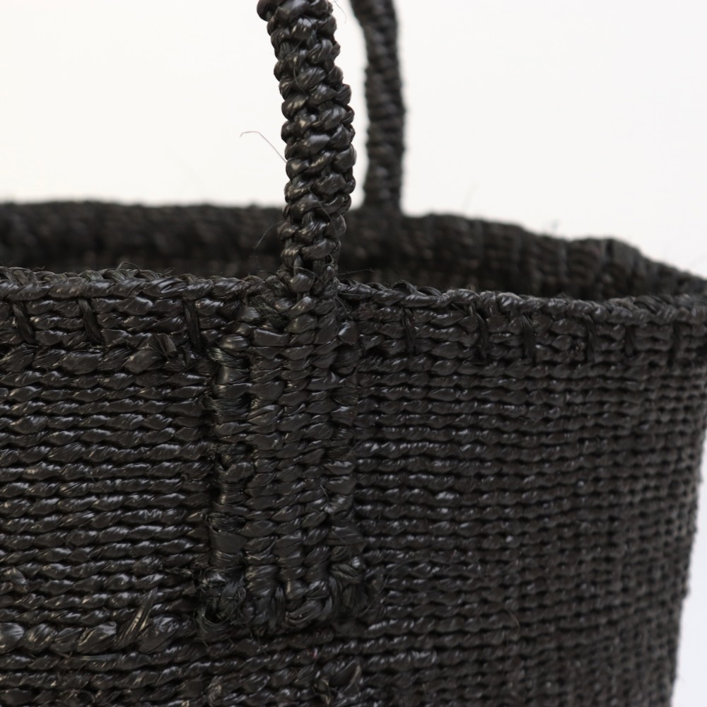 サイザルを芯に黒のビニールテープを編み込んだ、軽やかで頼もしいかごバッグ。一見ラフなのに、手仕事ならではの編みの美しさが際立ちます。水や汚れに強く、気負わず使えるのも魅力。日常のお出かけからレジャーまで、季節を問わず活躍してくれる一点です。
