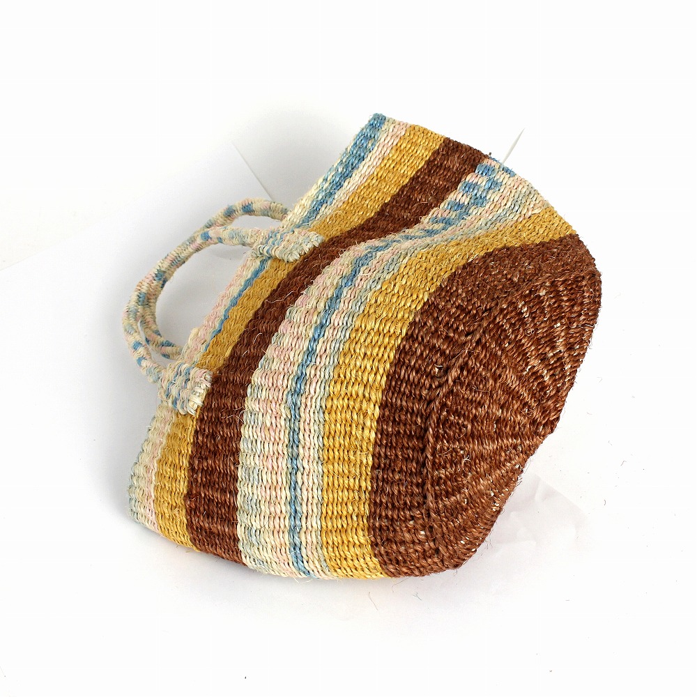 通常のかごを編んだときに少し余ってしまうサイザルでミニッグを作りました。スマホや財布など意外と色々入り、少しお出かけするのにちょうどよいサイズ、しっかりと細かく編んであるので大変丈夫。丸底なのでものも入ります。インテリアバスケットとしてもお使いいただけます。こちらは一点物です。