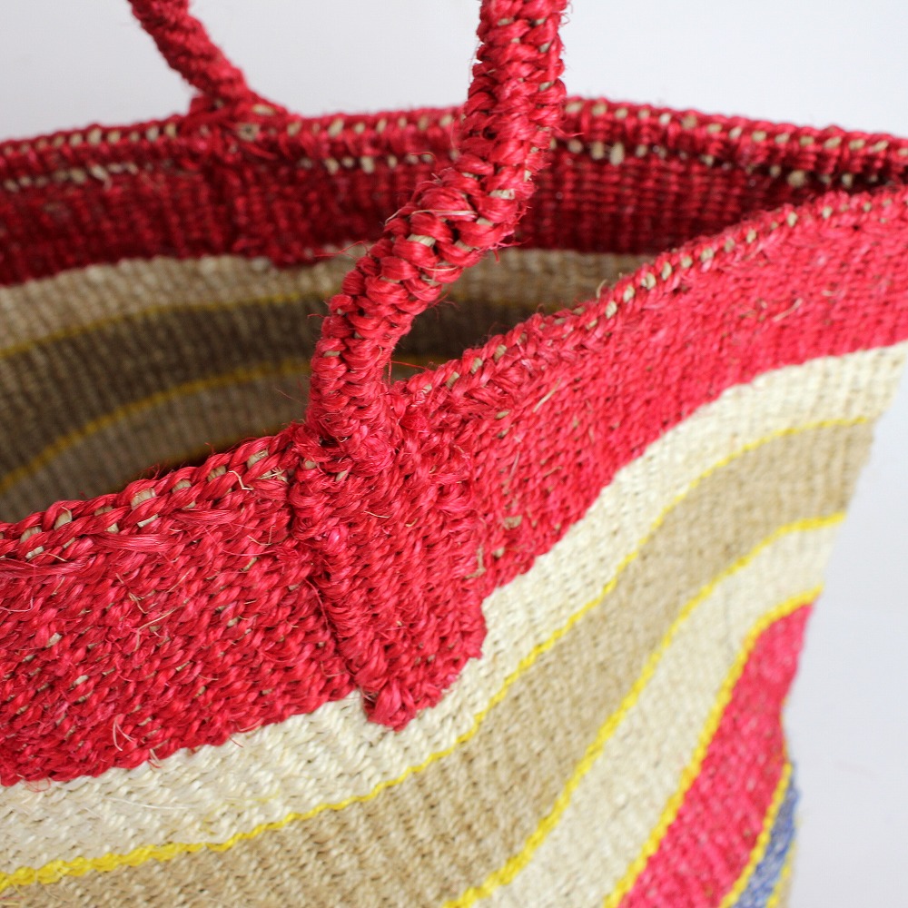 サイザルとはリュウゼツランの一種で、その繊維は歴史的に広く使われていた繊維である麻にちなんでサイザル麻と呼ばれています。ケニアのキクユ人やカンバ人の伝統技術により サイザルで編んだバスケット(=キオンド)は穀物の運搬や保存にケニアでは使われていました。かごを編む技術は母から娘へと受け継がれ、ケニアの小さな農村の女性を中心にひとつひとつ手作りで編み上げています。現在ではサイザルバッグを編むことがケニアの村の重要な現金収入源となり、各家庭の子どもたちの学費となり生活費の足しとなっています。