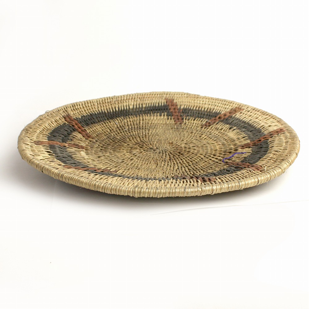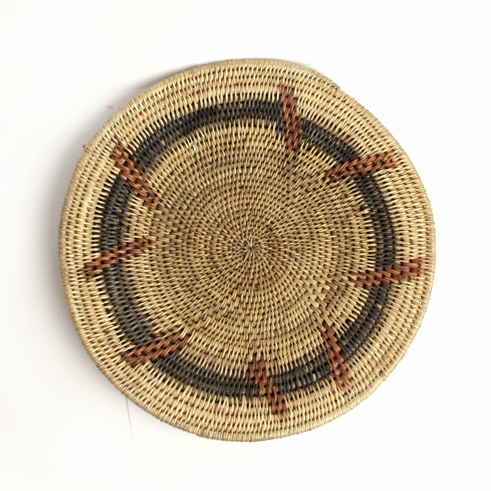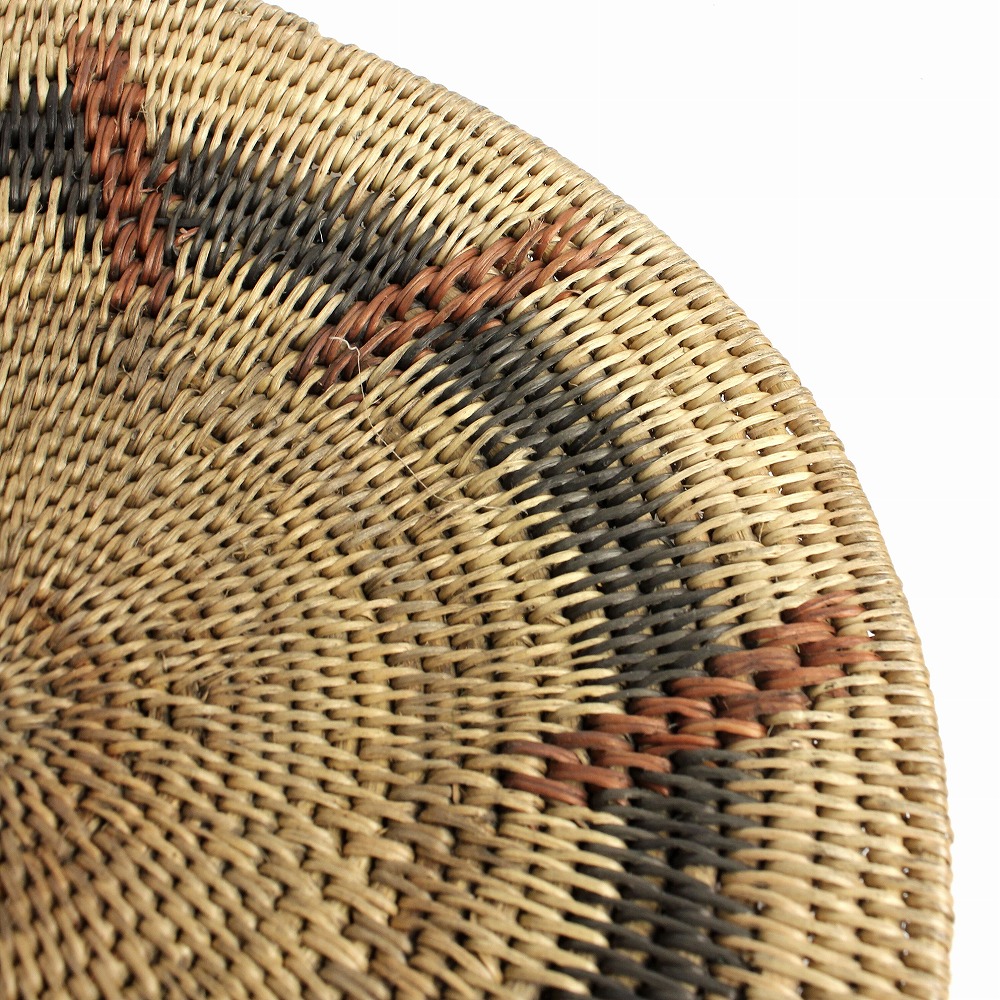 マケンゲバスケットは、ザンビアの西部州に古くから伝わる伝統的なバスケットです。 西部州の中心地、モング(Mongu)の水辺至る所に生えている灌木の丈夫な根や草を編んで作られています。慣習的に、婚礼の贈り物として母から娘へと代々受け継がれていき、100年以上のあいだ穀物の吹き上げや保管、また壁飾りとして愛用されます。抽象的なその模様には、「美しさ」、「結婚」、「家族」といったメッセージが込められています。長い年月の中で、編み目の隙間に入り込んだ穀物のかけらや味わいを増していく草木染の深い色味。古いものの美しさを感じるかごです。一点物