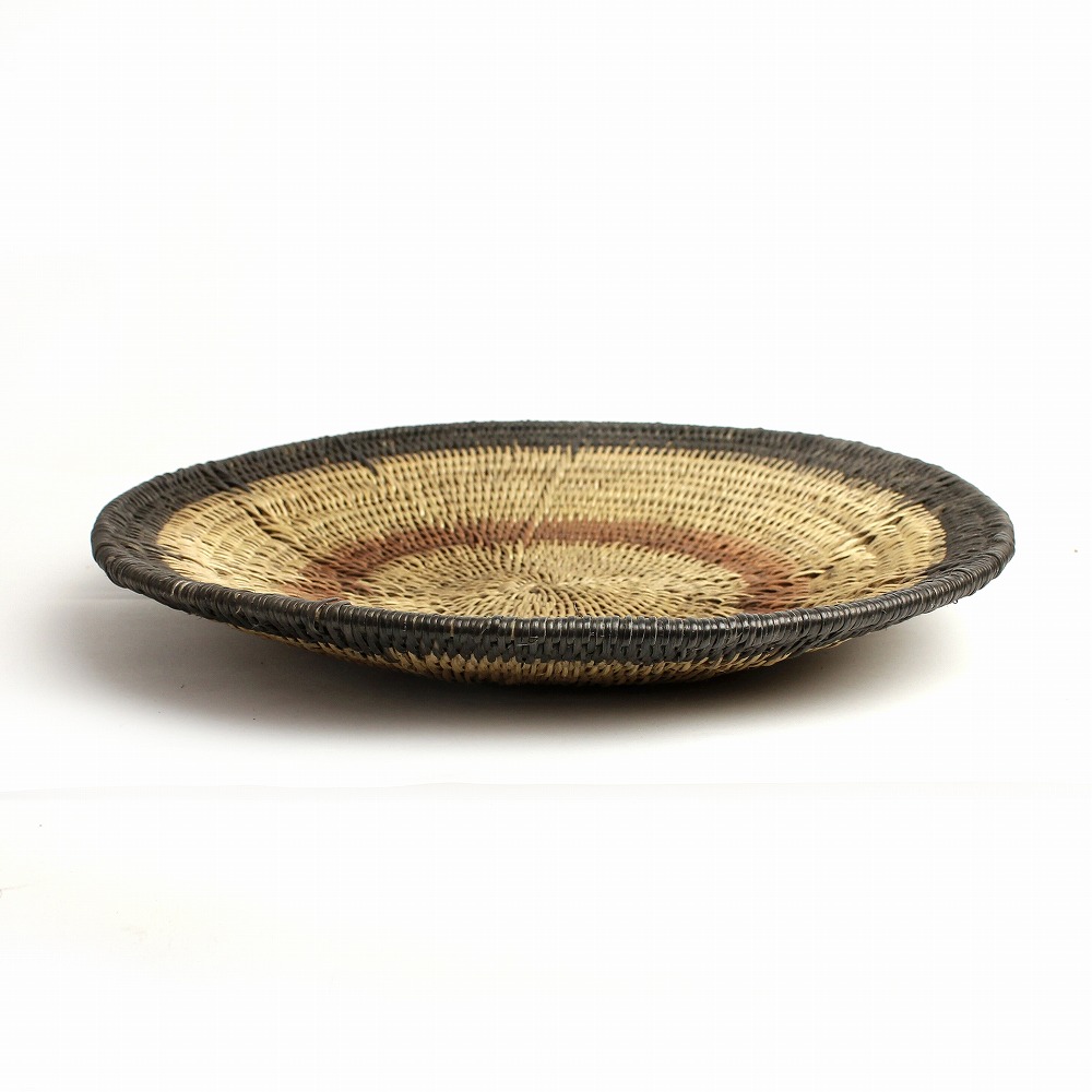 トンガバスケットは、ジンバブエ西部のビンガ地方で、 トンガ人の女性たちによってイララ(椰子の葉)を手編みして作られています。もとは穀物を運んだり選別するために使用されていました。 ストライプや蜘蛛の巣模様、稲妻模様などの伝統的なデザインと、四角い底の土台が特徴的。 放射状の葛に、ナチュラルなイララの葉と、樹皮や根、泥で染色を繰り返したブラウンの葉の二色が編み込まれ、二つとして同じ柄がないというの美しいカゴを創り出します。 また壺に似せたカラバッシュカゴをはじめ、様々なフォルムのカゴを器用に編み上げます。 これらは干ばつと貧困に見舞われやすい地域に住むトンガの人々にとって、貴重な現金収入となっています。 ひとつひとつ表情が異なるバスケットは、インテリアアイテムとして近年注目されています。
