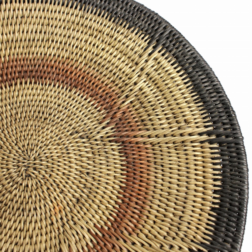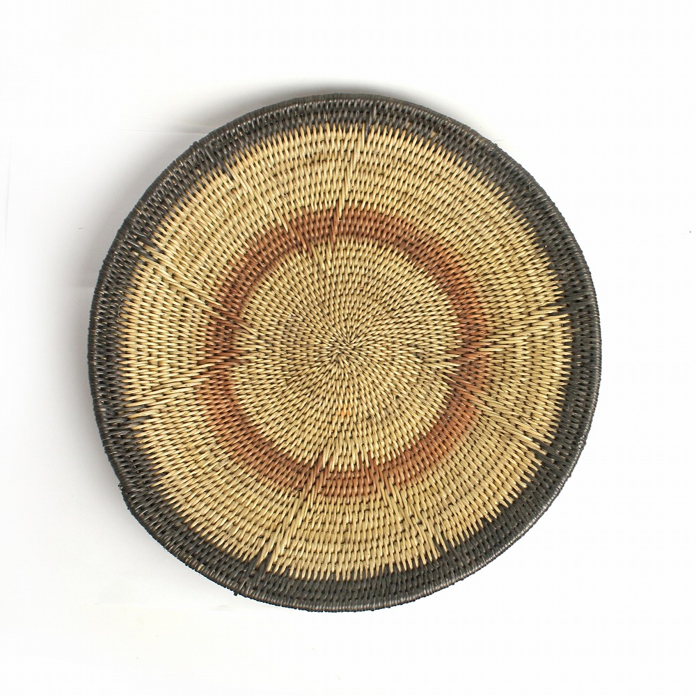 マケンゲバスケットは、ザンビアの西部州に古くから伝わる伝統的なバスケットです。 西部州の中心地、モング(Mongu)の水辺至る所に生えている灌木の丈夫な根や草を編んで作られています。慣習的に、婚礼の贈り物として母から娘へと代々受け継がれていき、100年以上のあいだ穀物の吹き上げや保管、また壁飾りとして愛用されます。抽象的なその模様には、「美しさ」、「結婚」、「家族」といったメッセージが込められています。長い年月の中で、編み目の隙間に入り込んだ穀物のかけらや味わいを増していく草木染の深い色味。古いものの美しさを感じるかごです。一点物
