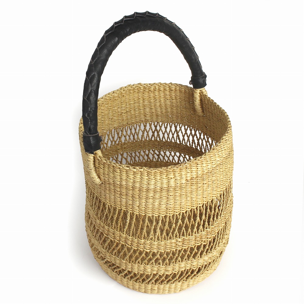 黒革ワンハンドルタイプのボルガ地方で作られるラウンドバスケットです。透かし模様と黒革ハンドルがポイント。素材は丈夫なエレファントグラスを使い、柄を編み込んだおしゃれな雰囲気のバスケットです。外出やお買い物、行楽に。植物をアレンジしてハンギングバスケットとしてもお使いいただけます。