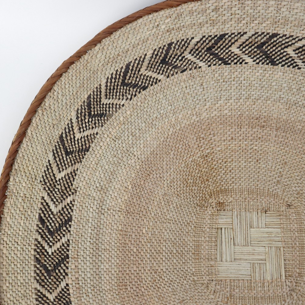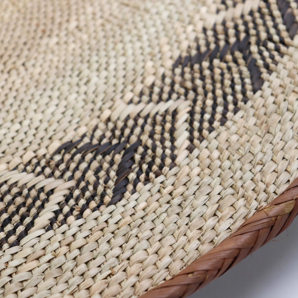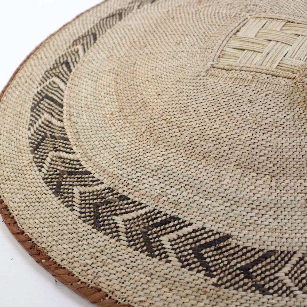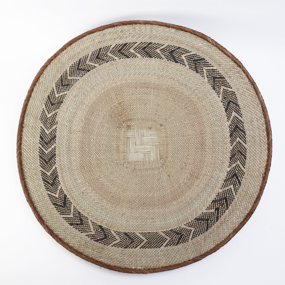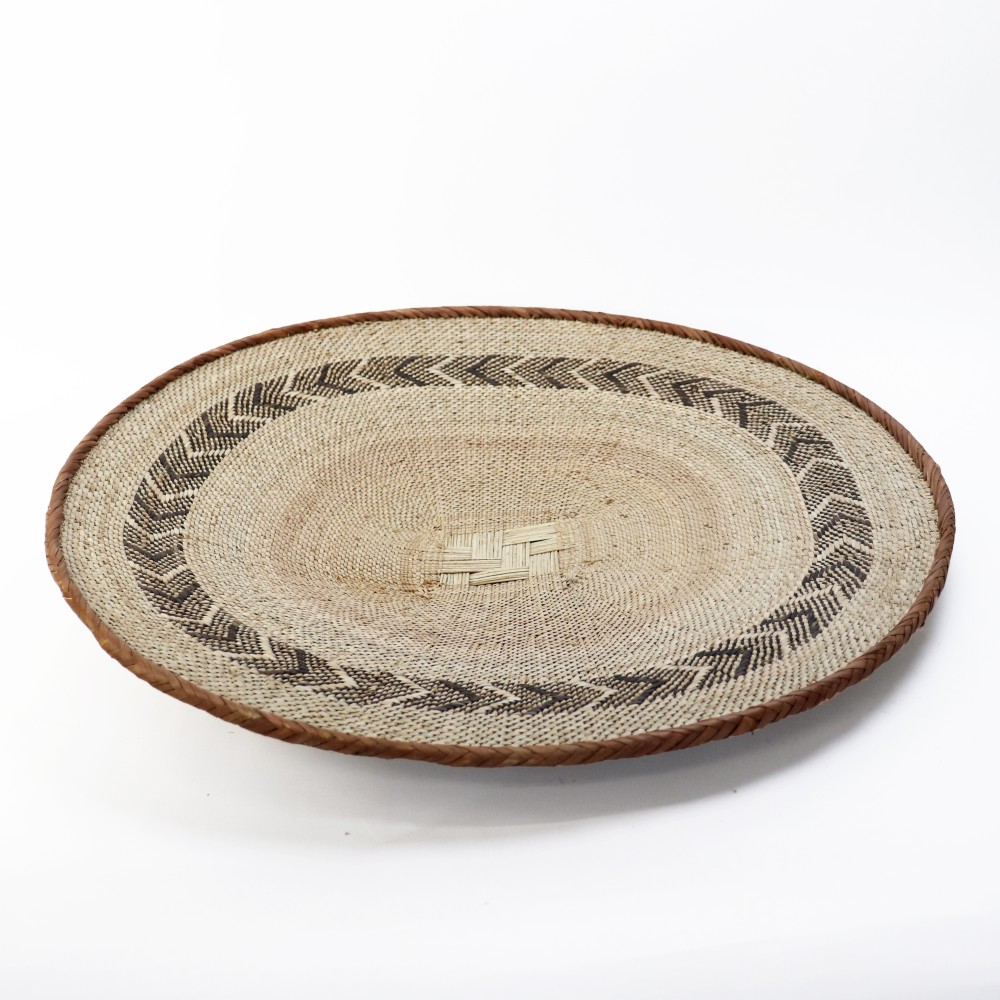 イララと呼ばれるパーム椰子を編み込んだ平カゴ特大サイズです。自然な色合いと複雑な模様が人気です。こちらは一点物のインテリア用特大カゴです。インパクトのあるサイズなので、店舗などの壁掛け用インテリアバスケットとしていかがでしょうか。ジンバブエのトンガ人の女性が一つ一つ編み上げる柄は実に多種多様、一つとして同じ柄が無いほどです。