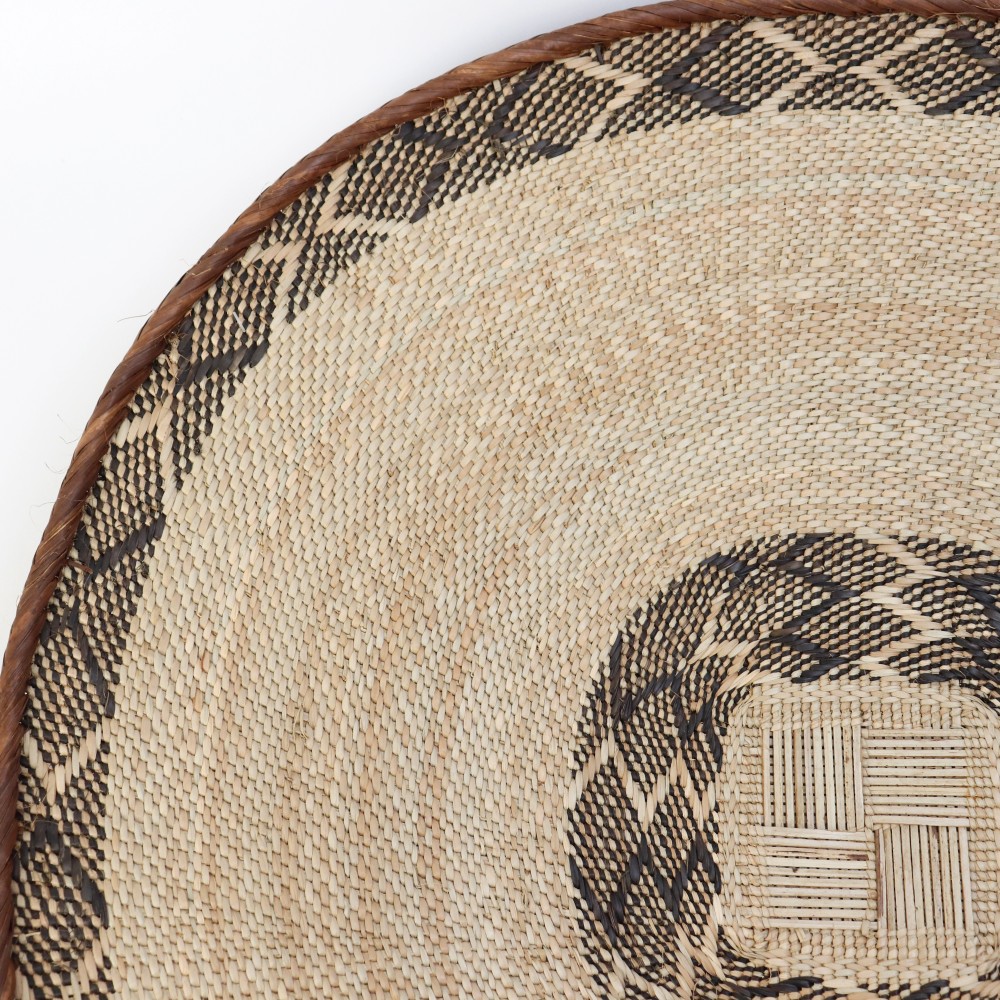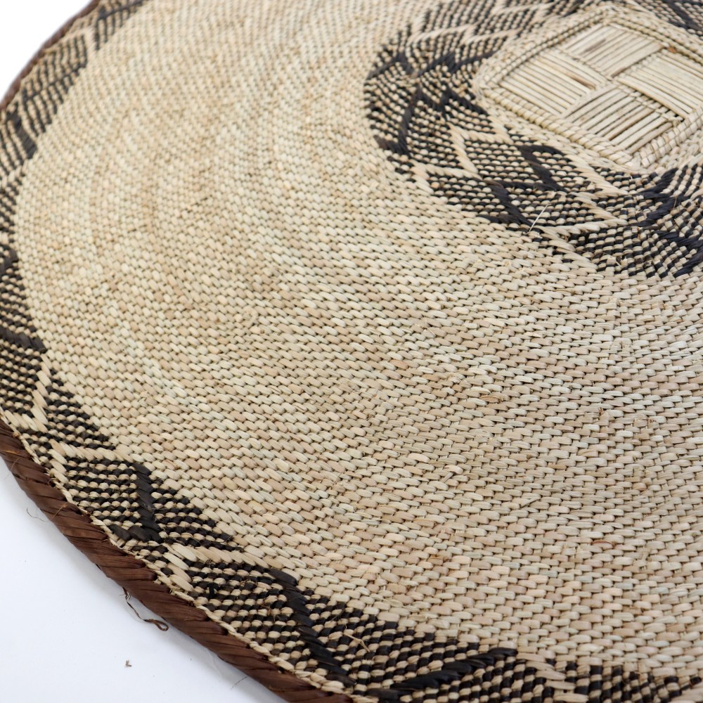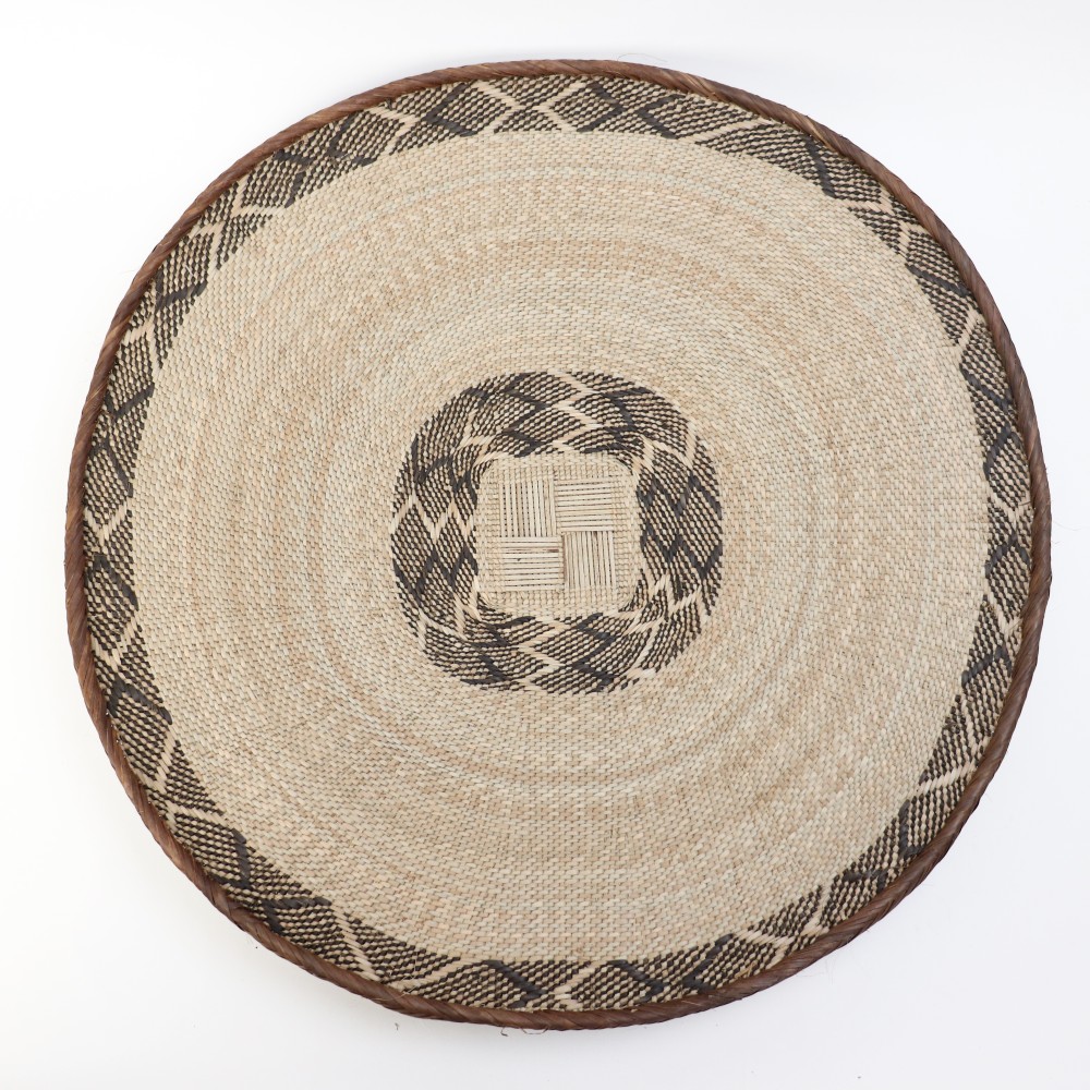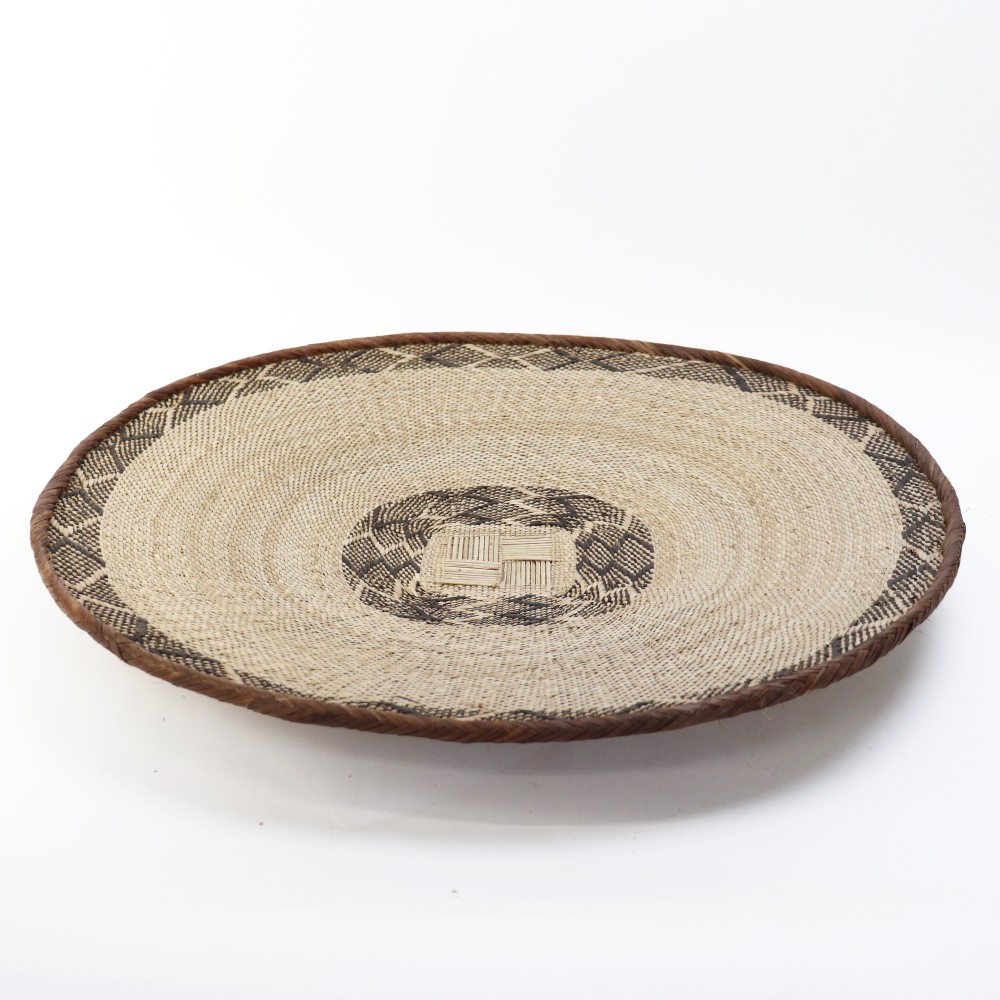 イララと呼ばれるパーム椰子を編み込んだ平カゴ特大サイズです。自然な色合いと複雑な模様が人気です。こちらは一点物のインテリア用特大カゴです。インパクトのあるサイズなので、店舗などの壁掛け用インテリアバスケットとしていかがでしょうか。ジンバブエのトンガ人の女性が一つ一つ編み上げる柄は実に多種多様、一つとして同じ柄が無いほどです。