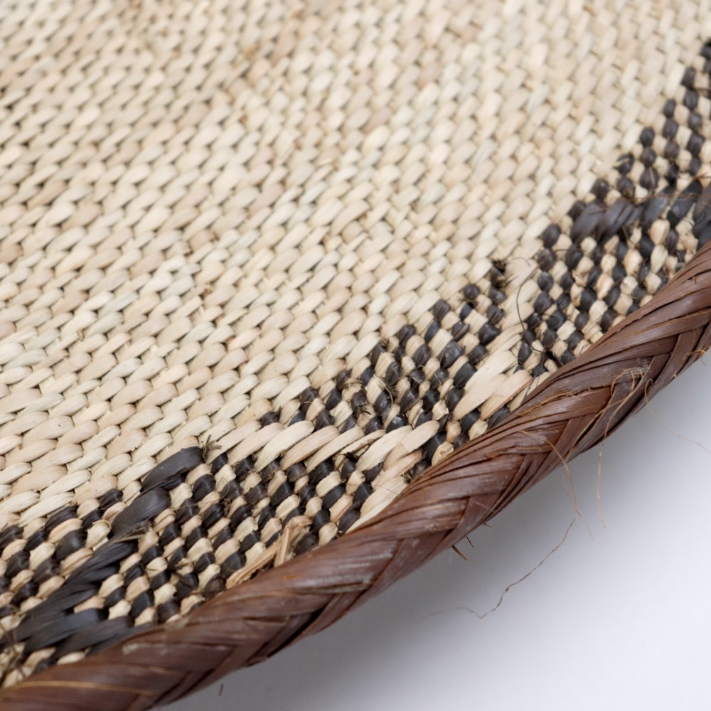 トンガバスケットは、ジンバブエ西部のビンガ地方で、 トンガ人の女性たちによってイララ(椰子の葉)を手編みして作られています。もとは穀物を運んだり選別するために使用されていました。 ストライプや蜘蛛の巣模様、稲妻模様などの伝統的なデザインと、四角い底の土台が特徴的。 放射状の葛に、ナチュラルなイララの葉と、樹皮や根、泥で染色を繰り返したブラウンの葉の二色が編み込まれ、二つとして同じ柄がないというの美しいカゴを創り出します。 また壺に似せたカラバッシュカゴをはじめ、様々なフォルムのカゴを器用に編み上げます。 これらは干ばつと貧困に見舞われやすい地域に住むトンガの人々にとって、貴重な現金収入となっています。 ひとつひとつ表情が異なるバスケットは、インテリアアイテムとして近年注目されています。