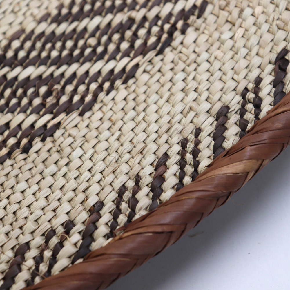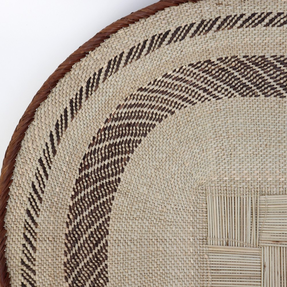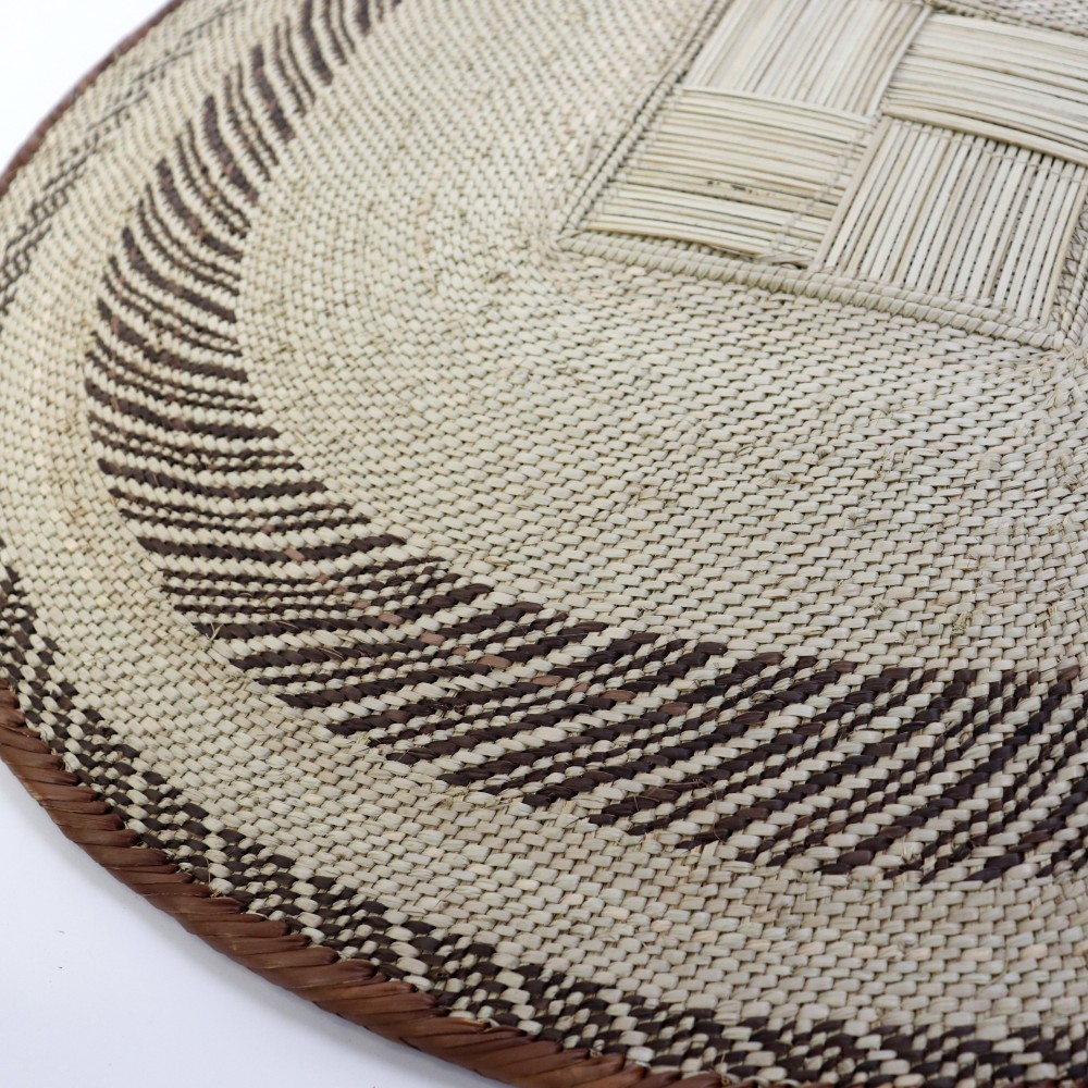 イララと呼ばれるパーム椰子を編み込んだ平カゴ特大サイズです。自然な色合いと複雑な模様が人気です。こちらは一点物のインテリア用特大カゴです。インパクトのあるサイズなので、店舗などの壁掛け用インテリアバスケットとしていかがでしょうか。ジンバブエのトンガ人の女性が一つ一つ編み上げる柄は実に多種多様、一つとして同じ柄が無いほどです。
