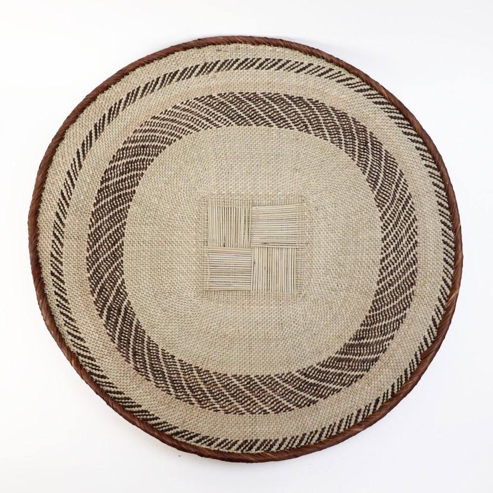 トンガバスケットは、ジンバブエ西部のビンガ地方で、 トンガ人の女性たちによってイララ(椰子の葉)を手編みして作られています。もとは穀物を運んだり選別するために使用されていました。 ストライプや蜘蛛の巣模様、稲妻模様などの伝統的なデザインと、四角い底の土台が特徴的。 放射状の葛に、ナチュラルなイララの葉と、樹皮や根、泥で染色を繰り返したブラウンの葉の二色が編み込まれ、二つとして同じ柄がないというの美しいカゴを創り出します。 また壺に似せたカラバッシュカゴをはじめ、様々なフォルムのカゴを器用に編み上げます。 これらは干ばつと貧困に見舞われやすい地域に住むトンガの人々にとって、貴重な現金収入となっています。 ひとつひとつ表情が異なるバスケットは、インテリアアイテムとして近年注目されています。