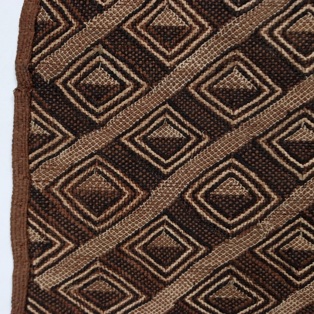 こちらは草ビロードとも呼ばれるショワの人々が作るクバ布で、平織のラフィアの生地に2種類の刺繍の技法を組みああせて作られています。規則性がありながらも自由さがうかがえる模様には、人を惹きつけてやまない魅力にあふれています。こちらの商品は一点物です。